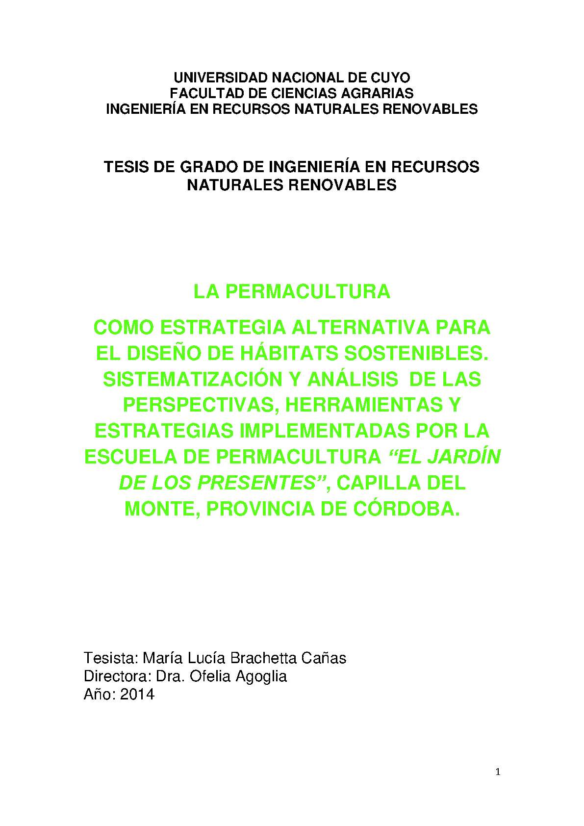 El presente trabajo ha sido realizado en el marco de la asignatura Proyecto de Tesis de la carrera Ingeniería en Recursos Naturales Renovables de la Facultad de Ciencias Agrarias (FCA), perteneciente a la Universidad Nacional de Cuyo (UNCuyo).