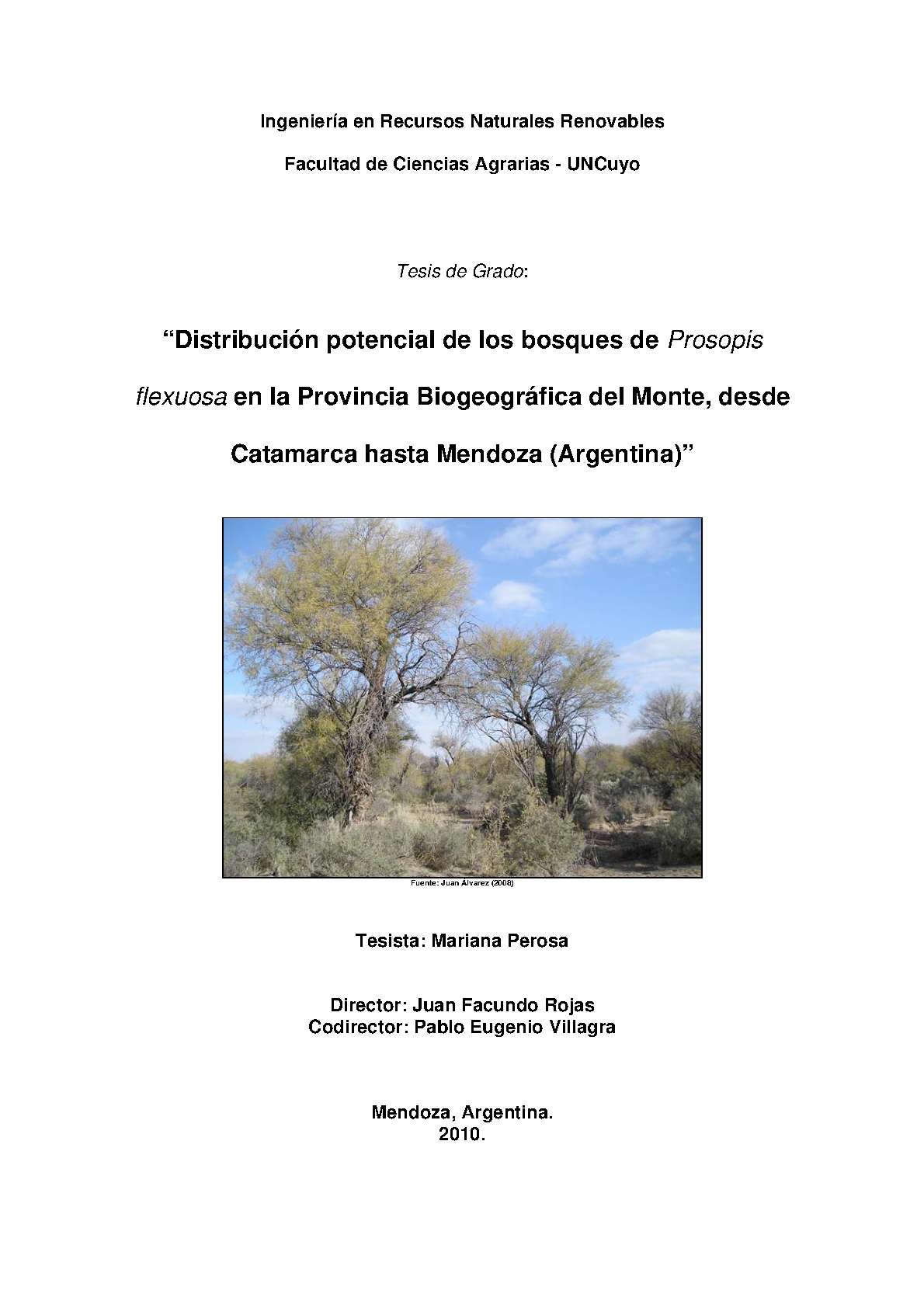 Perosa, Mariana. (2010). Distribución potencial de los bosques de prosopis flexuosa en la provincia biogeográfica del monte: desde Catamarca hasta Mendoza (Argentina) (Tesina de grado). Mendoza, Universidad Nacional de Cuyo. Facultad de Ciencias Agrarias .
