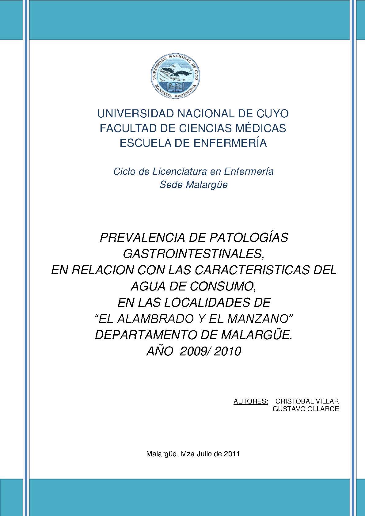 Villar, Cristóbal; Ollarce, Gustavo. (2011). Prevalencia de patologías gastrointestinales, en relación con las características del agua de consumo, en las localidades de El Alambrado y El Manzano, departamento de Malargüe: año 2009/2010 (Tesina de grado). Mendoza, Universidad Nacional de Cuyo. Facultad de Ciencias Médicas. Escuela de Enfermería..