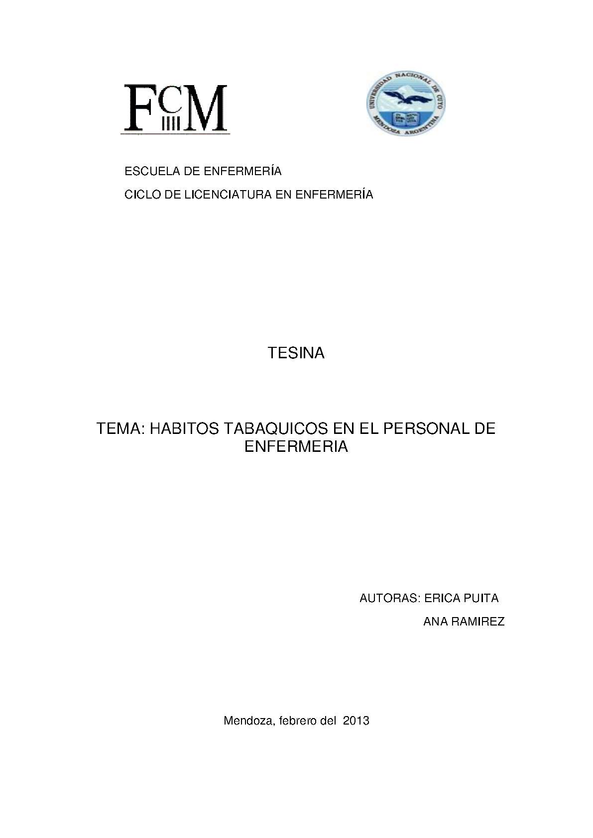 Esta tesina se elaboró con el objetivo de conocer si el hábito de fumar interfiere en el desempeño laboral de los enfermeros de Clínica Médica del Hospital Del Carmen. Para ello se incluyó material de diferentes fuentes y autores con la idea de tener una amplia información que sirva como marco teórico para la investigación.