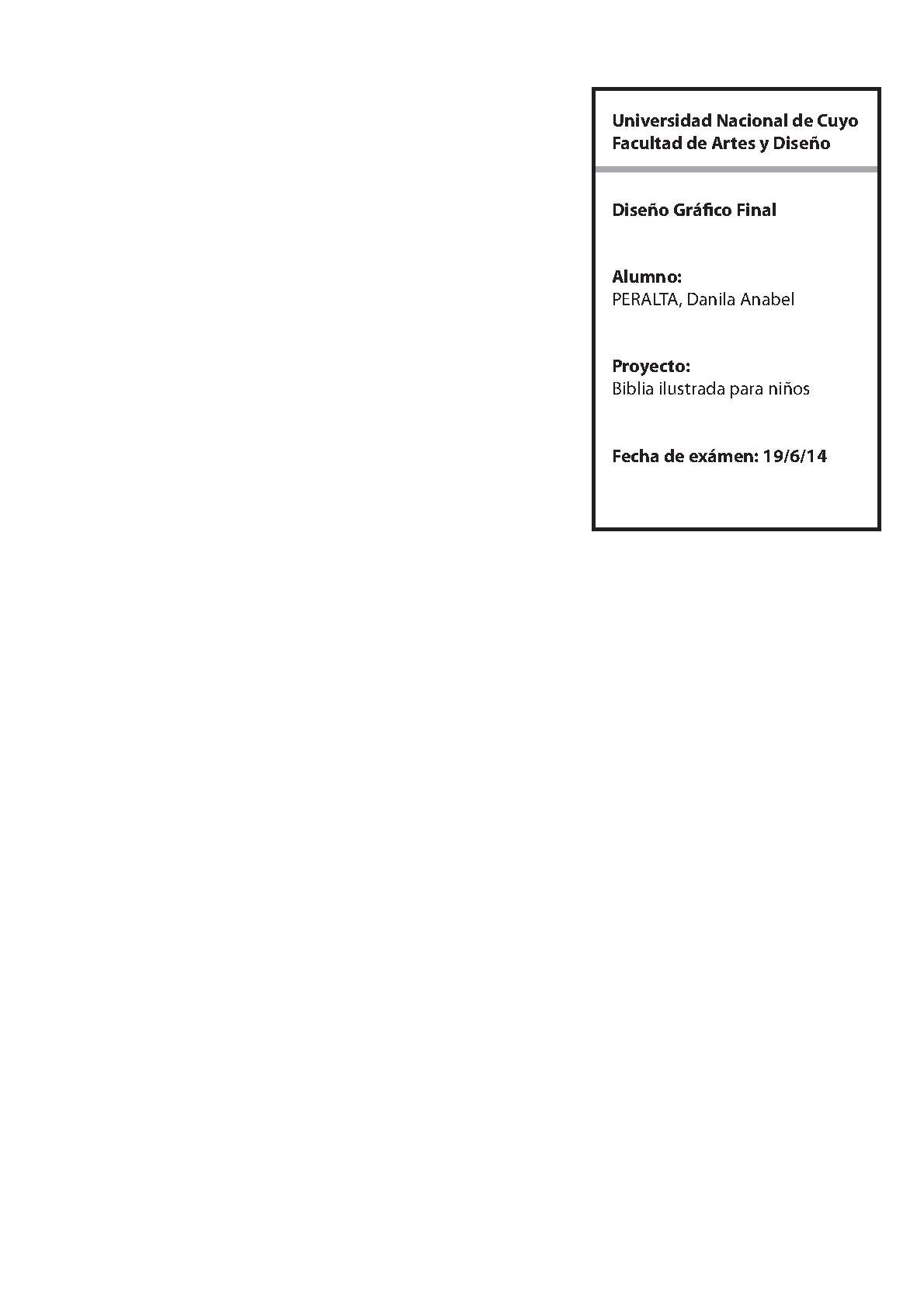 Peralta, Danila Anabel. (2014). Biblia ilustrada para niños: (Trabajo final de grado). Mendoza, Universidad Nacional de Cuyo. Facultad de Artes y Diseño .