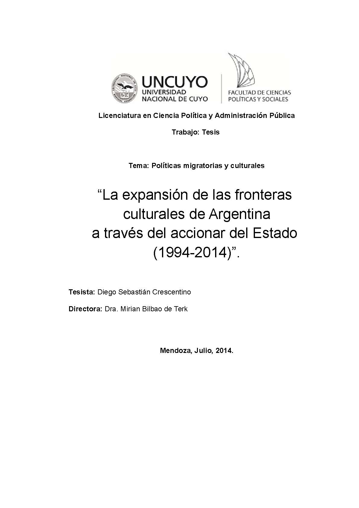 Crescentino, Diego Sebastián. (2014). La expansión de las fronteras culturales de Argentina a través del accionar del Estado: (1994-2014) (Tesina de grado). Mendoza, Universidad Nacional de Cuyo. Facultad de Ciencias Políticas y Sociales .