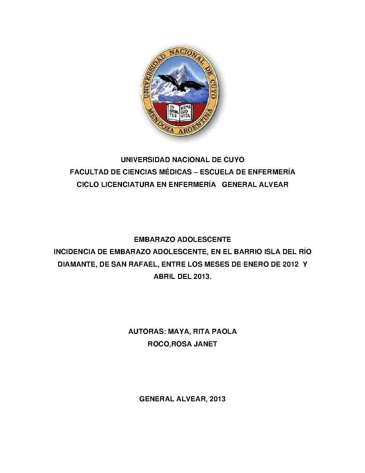 Maya, Rita Paola; Roco, Rosa Janet. (2013). Embarazo adolescente: incidencia de embarazo adolescente, en el barrio Isla del Río Diamante, de San Rafael, entre los meses de enero de 2012 y abril del 2013 (Tesina de grado). Mendoza, Universidad Nacional de Cuyo. Facultad de Ciencias Médicas. Escuela de Enfermería..