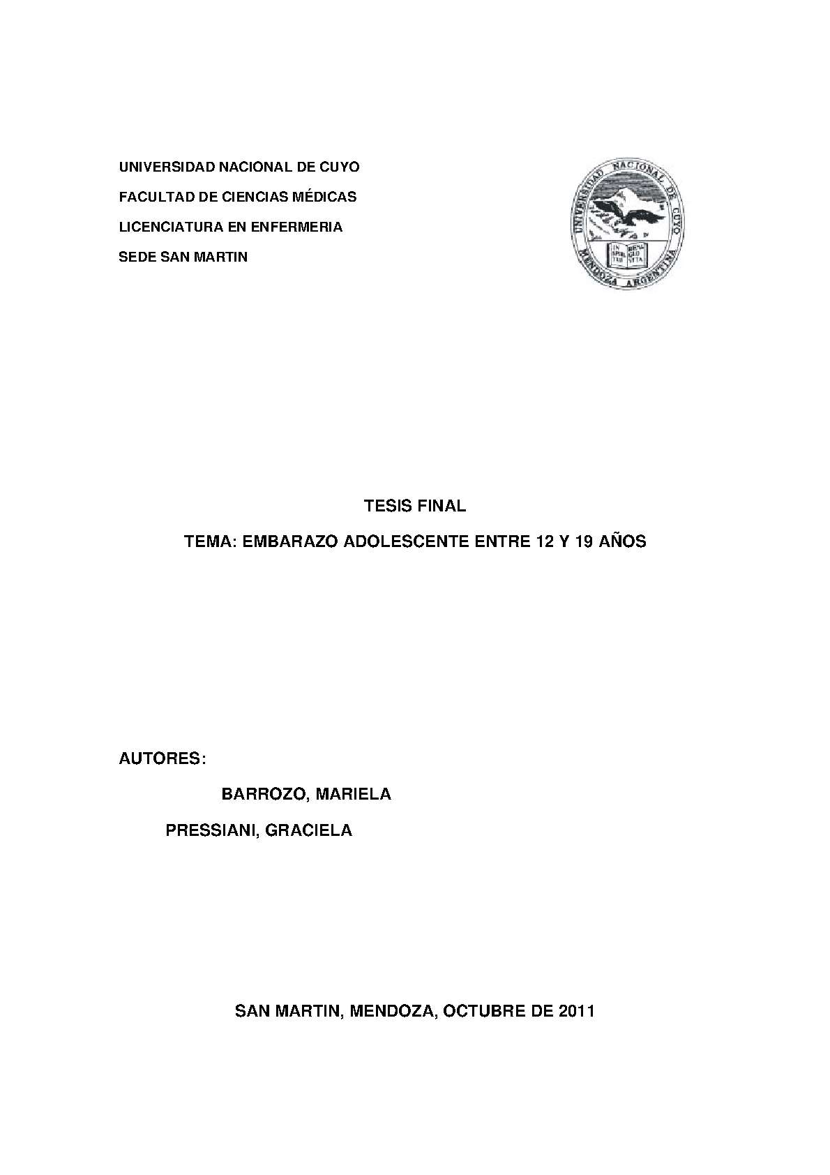 EMBARAZO EN ADOLESCENCIA/PREVENCIÓN Y CONTROL - EMBARAZO - ADOLESCENTES - ABANDONO ESCOLAR - FACTORES DE RIESGO - EMBARAZO NO PLANEADO - SANTA ROSA (MENDOZA, ARGENTINA)