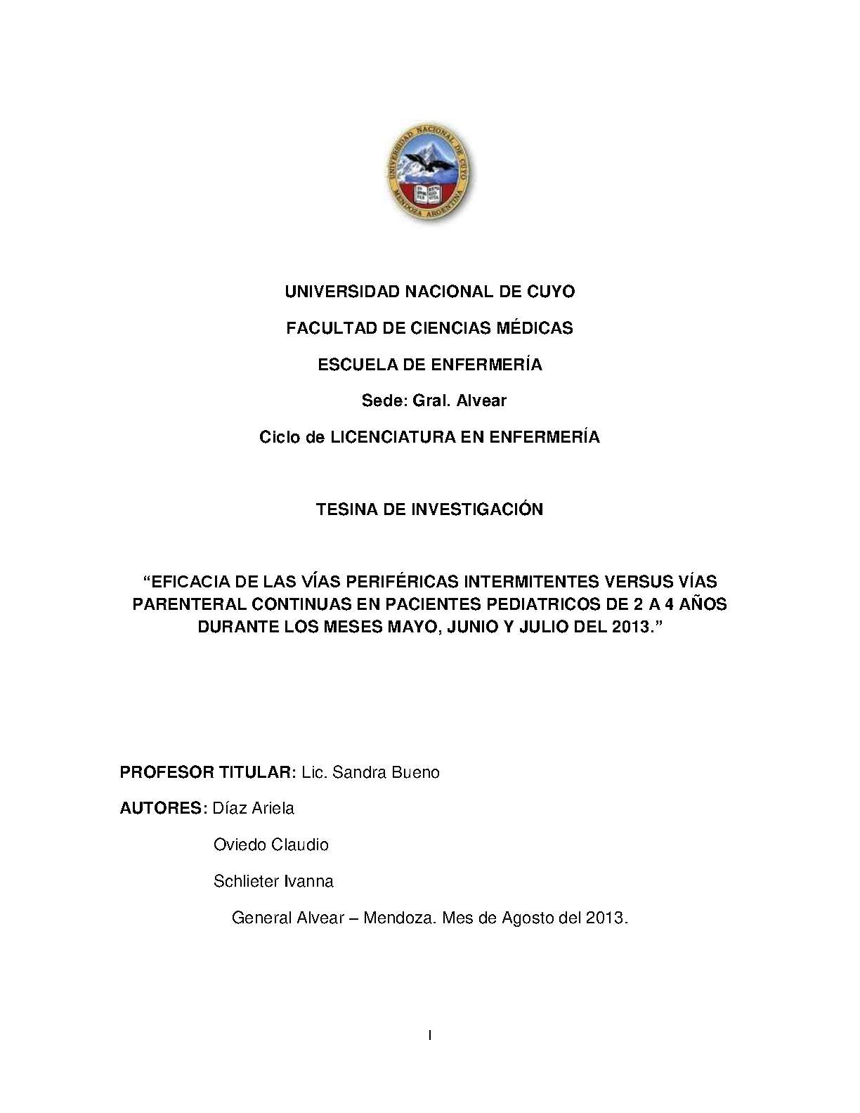Díaz, Ariela; Oviedo, Claudio; Schlieter, Ivana. (2013). Eficacia de las vías periféricas intermitentes versus vías parenteral continuas en pacientes pediátricos de 2 a 4 años durante los meses mayo, junio y julio del 2013: (Tesina de grado). Mendoza, Universidad Nacional de Cuyo. Facultad de Ciencias Médicas. Escuela de Enfermería..