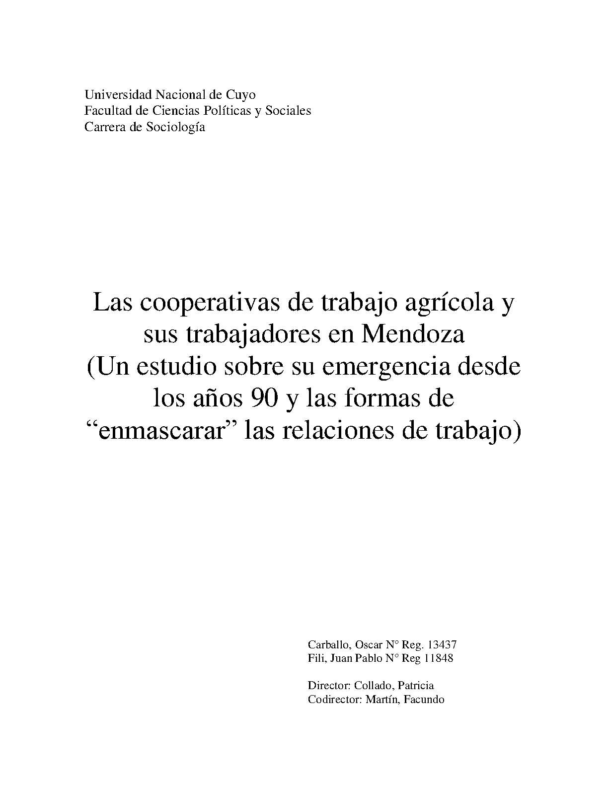 Esta tesis se ocupa de las cooperativas de trabajo agrícola en la provincia de Mendoza. Ellas son consideradas uno de los instrumentos de fraude laboral más difundido de las últimas décadas. Sin embargo a lo largo de este trabajo se verá que su emergencia es producto de factores más profundos, relacionados con las nuevas formas que adopta la producción agrícola y no únicamente un medio para reducir costos laborales.