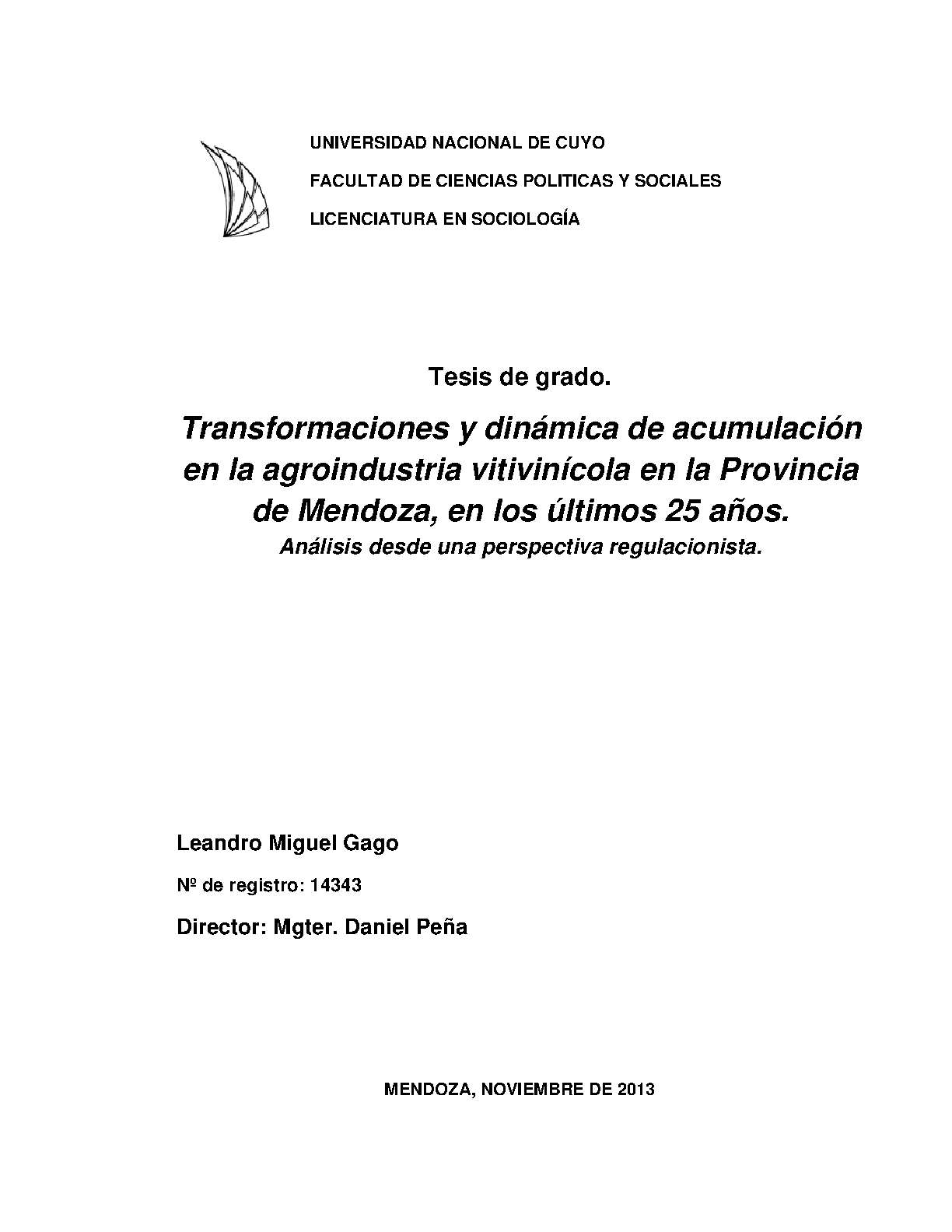 Gago, Leandro Miguel. (2013). Transformaciones y dinámica de acumulación en la agroindustria vitivinícola en la Provincia de Mendoza, en los últimos 25 años: análisis desde una perspectiva regulacionista (Tesina de grado). Mendoza, Universidad Nacional de Cuyo. Facultad de Ciencias Políticas y Sociales .