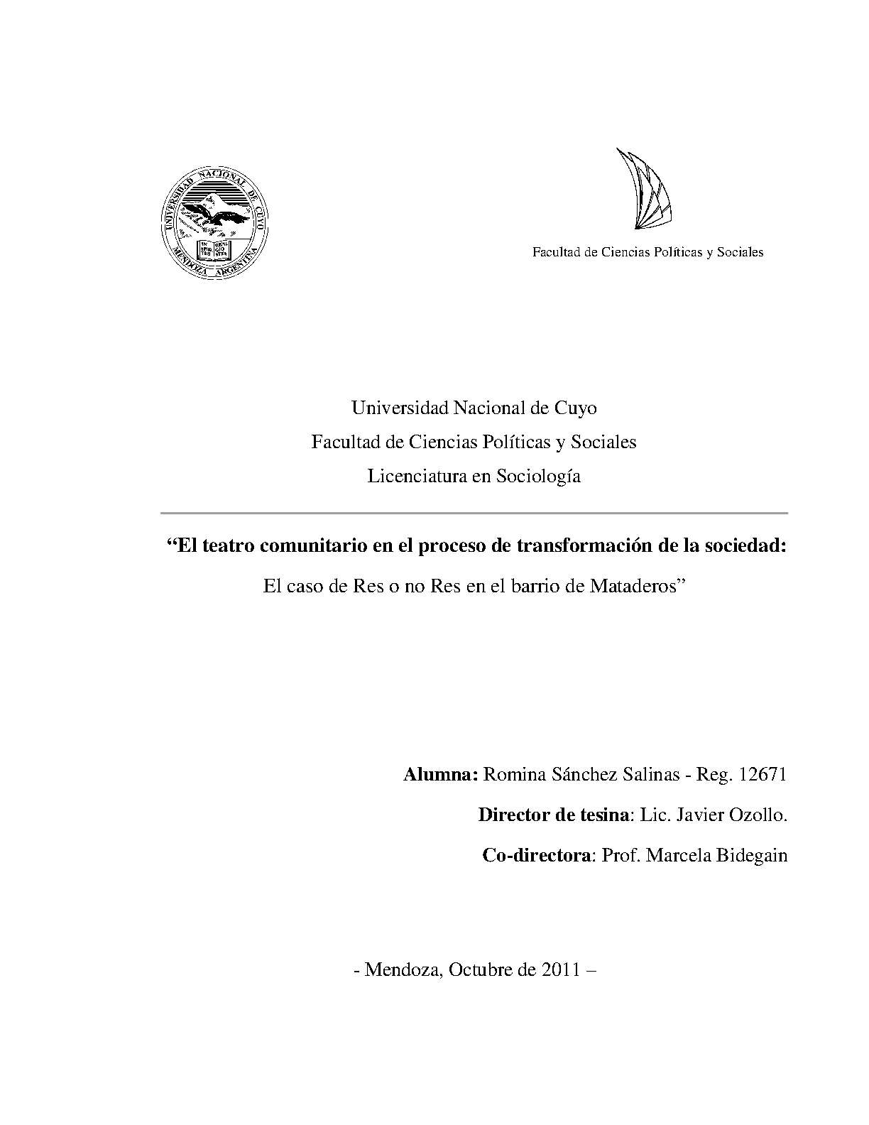 Este trabajo se centra en un estudio de caso para analizar el fenómeno: el caso del grupo de teatro comunitario Res o no Res en el barrio de Mataderos.Sin intención de generalizar la práctica de teatro comunitario ni de homogeneizar las particularidades que presenta cada grupo, se parte de la idea de que las características distintivas de este fenómeno lo ubican dentro de lo que se llama movimientos culturales contrahegemónicos, en tanto se proponen cambiar la visión del mundo que se presenta como dada y guardan en su seno el germen de un nuevo modelo de organización social.