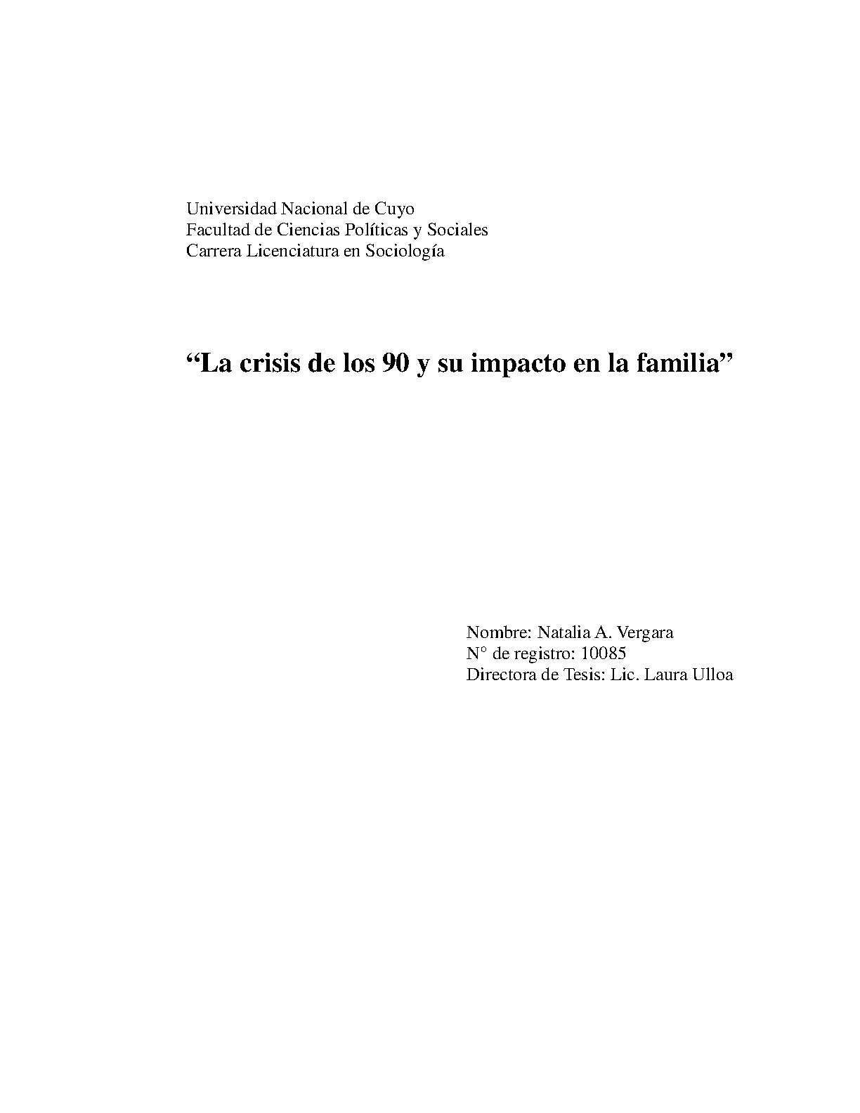 Vergara, Natalia. (2012). La crisis de los '90 y su impacto en la familia: (Tesina de grado). Mendoza, Universidad Nacional de Cuyo. Facultad de Ciencias Políticas y Sociales .