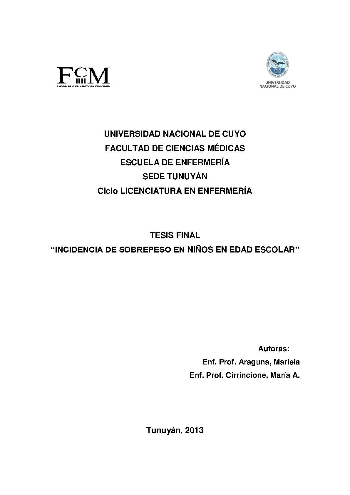 Araguna, Mariela; Cirrincione, María A.. (2013). Incidencia de sobrepeso en niños en edad escolar: (Tesina de grado). Mendoza, Universidad Nacional de Cuyo. Facultad de Ciencias Médicas. Escuela de Enfermería..