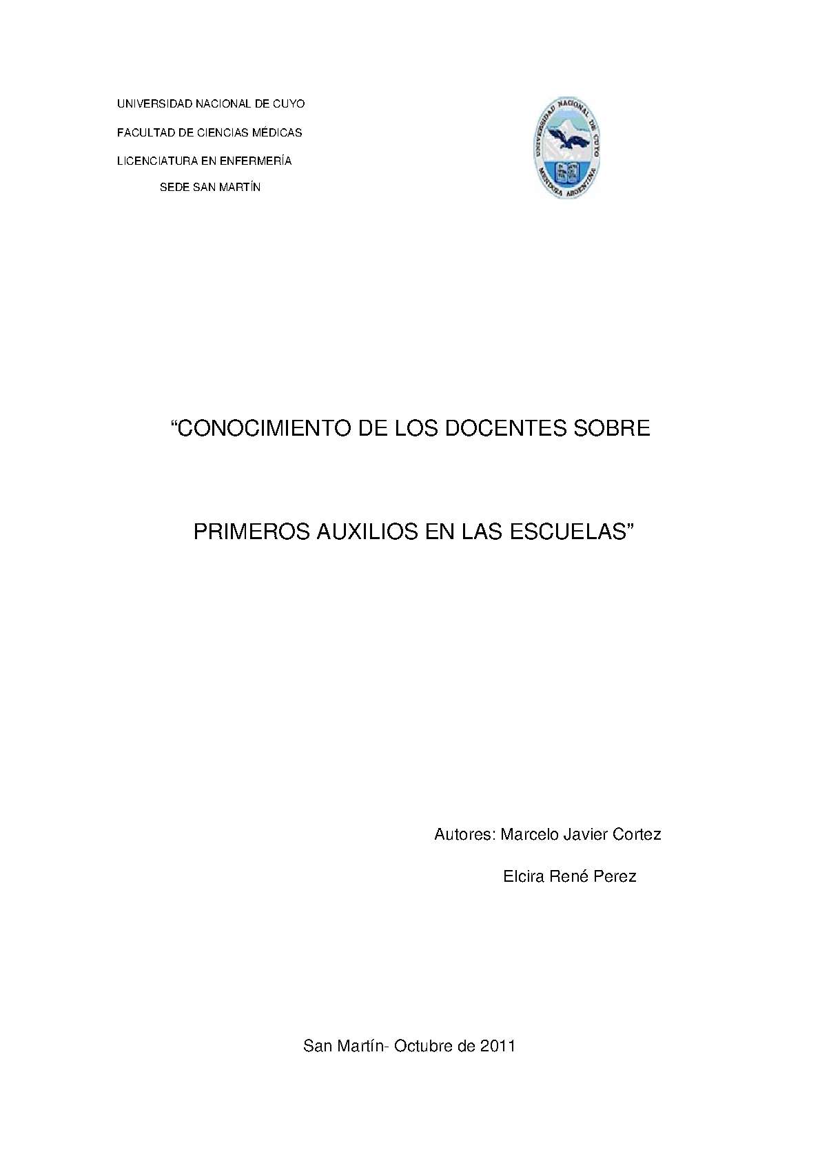 Cortez, Marcelo Javier; Pérez, Elcira René. (2011). Conocimiento de los docentes sobre primeros auxilios en las escuelas: (Tesina de grado). Mendoza, Universidad Nacional de Cuyo. Facultad de Ciencias Médicas. Escuela de Enfermería..