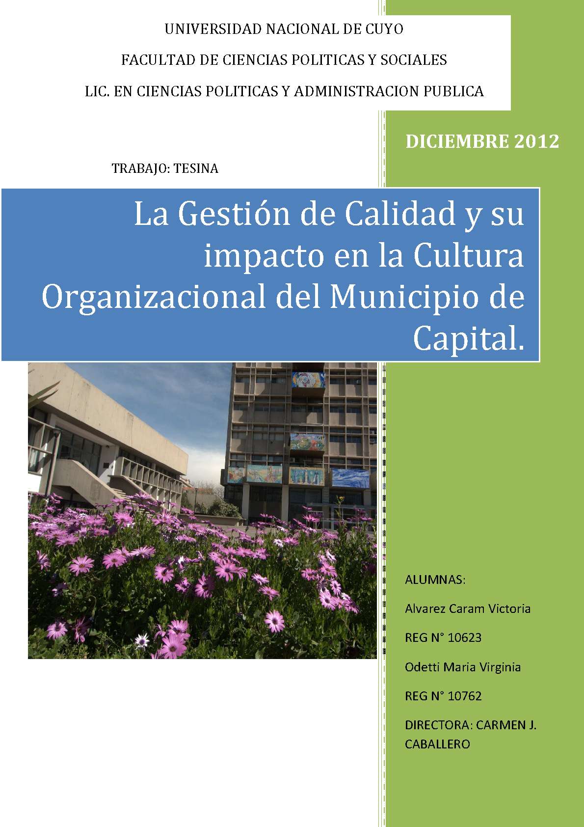 Álvarez Caram, Victoria; Odetti, María Virginia. (2012). La gestión de calidad y su impacto en la cultura organizacional del Municipio de capital: (Tesina de grado). Mendoza, Universidad Nacional de Cuyo. Facultad de Ciencias Políticas y Sociales .