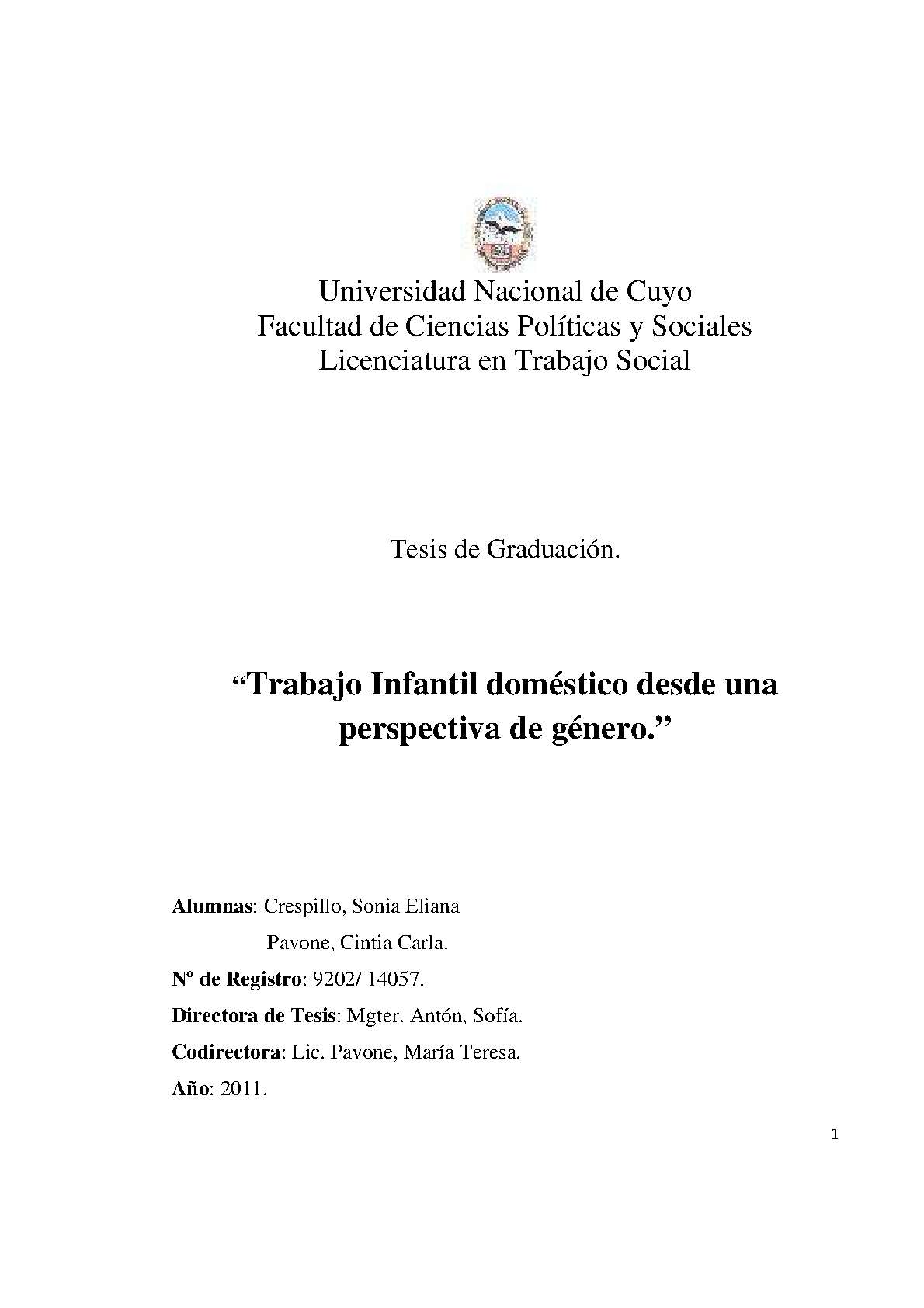 trabajo infantil aqueja a una gran cantidad de niños, niñas y adolescentes cercenando sus posibilidades reales de desarrollarse como sujetos plenos de derechos. Específicamente vamos a centrarnos en el trabajo doméstico, ya que es la tipología menos visible y en la cual la impronta de género hace que recaiga fundamentalmente en las niñas, debido a que es la “mujer" quien debe ocuparse de la reproducción social de la vida porque los quehaceres domésticos “son tareas de mujeres".