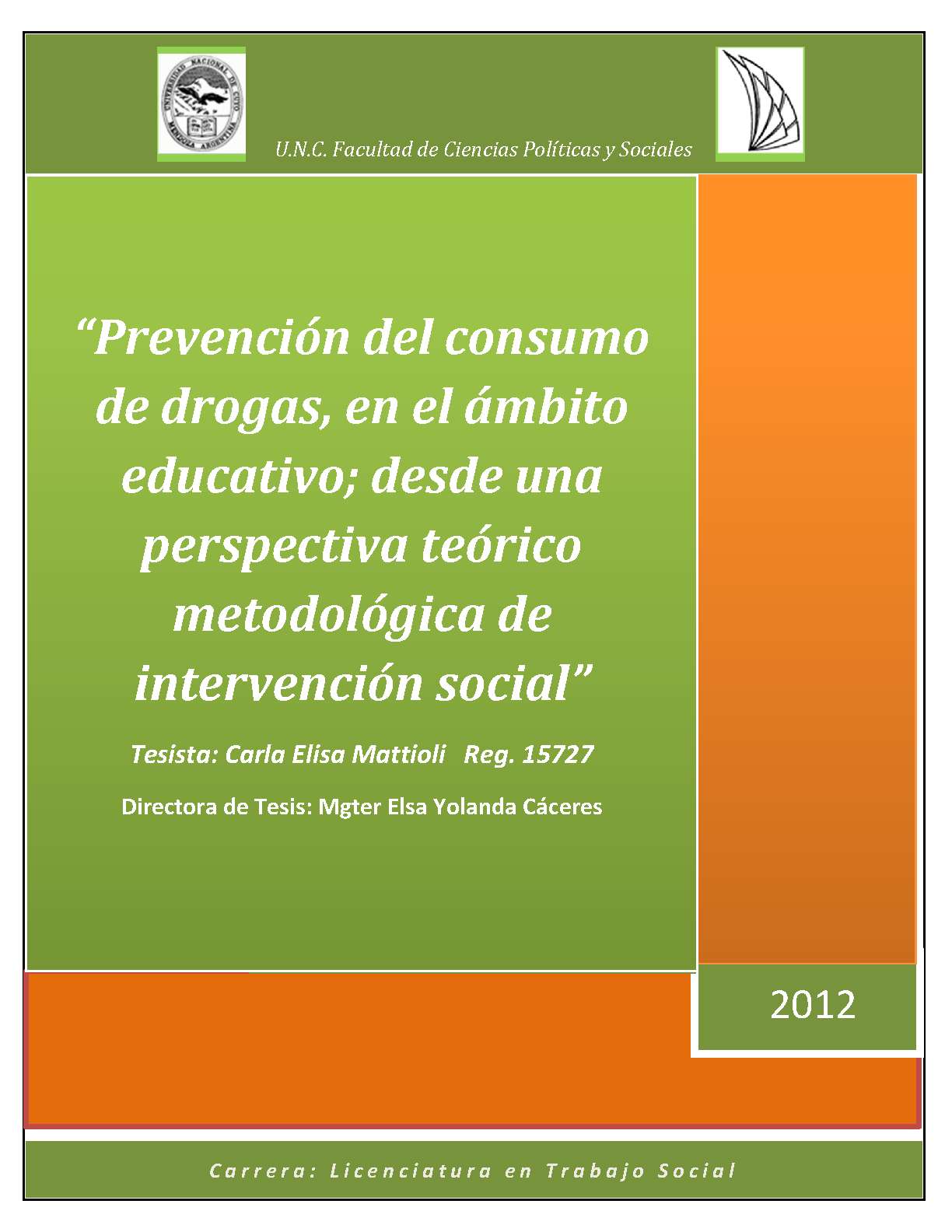 Mattioli, Carla Elisa. (2012). Prevención del consumo de drogas en el ámbito educativo: desde una perspectiva teórico metodológica de intervención social (Tesina de grado). Mendoza, Universidad Nacional de Cuyo. Facultad de Ciencias Políticas y Sociales .