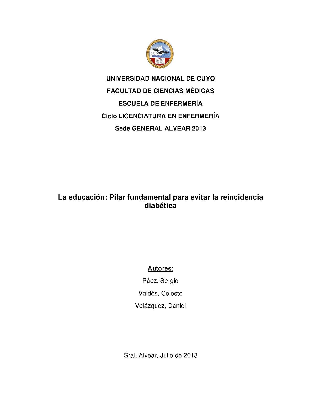 La Diabetes mellitus es una enfermedad que afecta a todos los Individuos sin distinción alguna de edad, sexo ni nivel económico. Constituye la tercera causa de mortalidad a nivel mundial. En los últimos tiempos, producto del ritmo de la vida y diversos problemas se ha notado una reincidencia en la patología Diabetes en el servicio de clínica médica del Hospital Enfermeros Argentinos de General Alvear. Se toma para esta investigación una población de 40 personas diabéticas internadas en el servicio de clínica médica con una muestra de 20 pacientes reincidentes, desde el mes de Enero de 2013 hasta el mes de abril 2013.