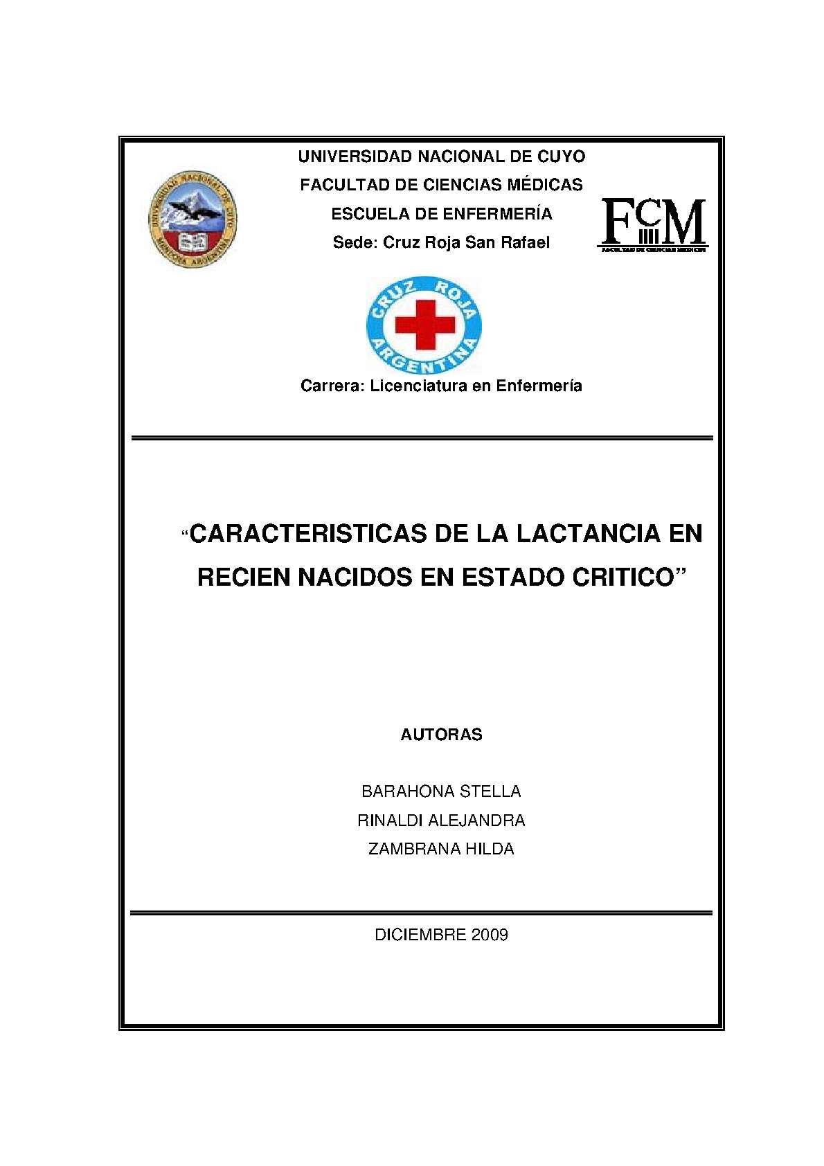 LACTANCIA MATERNA - RECIÉN NACIDO - PREMATURO - ENFERMEDAD CRÍTICA - HOSPITAL TEODORO SCHESTAKOW (SAN RAFAEL, MENDOZA, ARGENTINA)