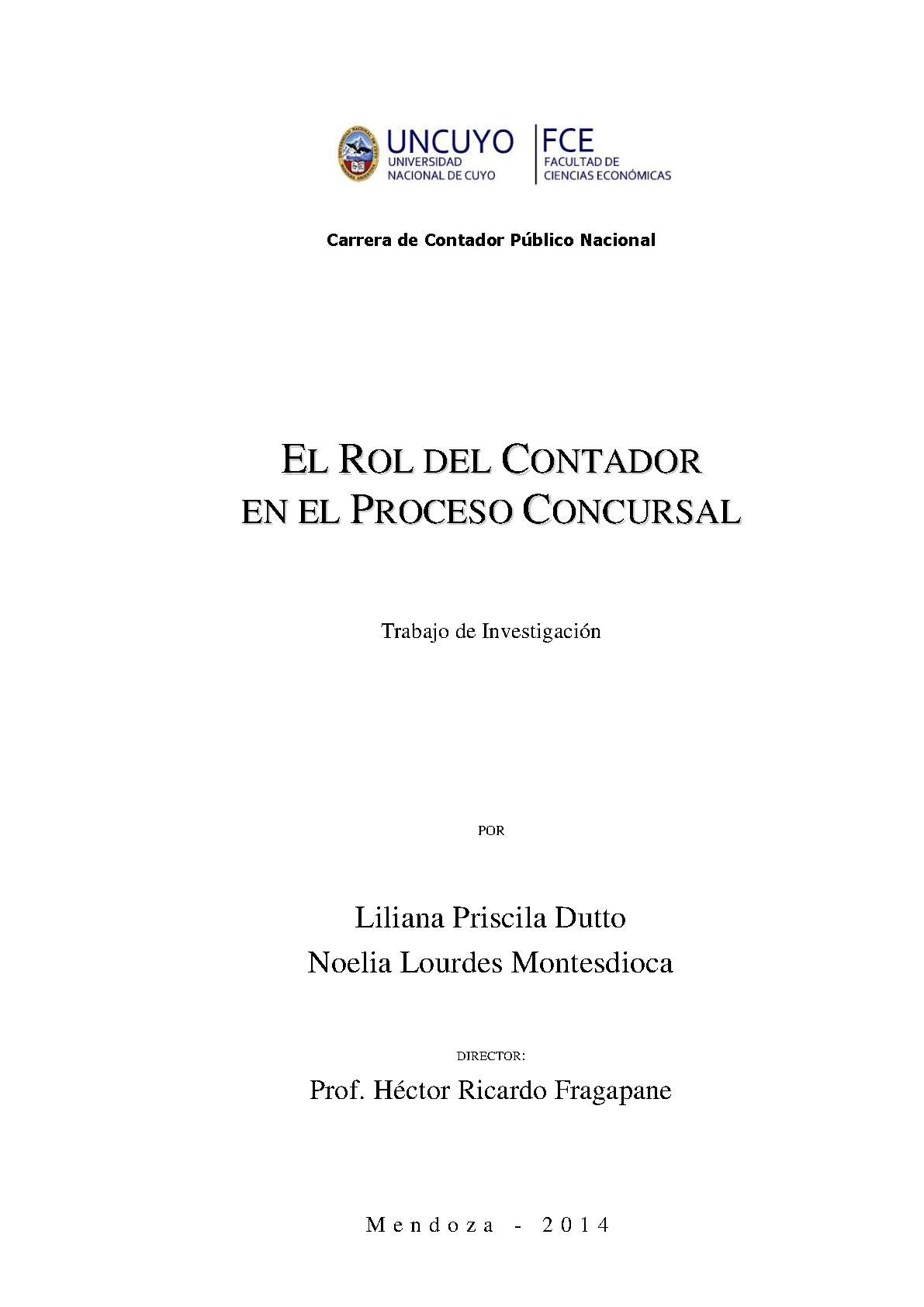 Dutto, Liliana Priscila; Montesdioca, Noelia Lourdes. (2014). El rol del contador en el proceso concursal: (Trabajo final de grado). Mendoza, Universidad Nacional de Cuyo. Facultad de Ciencias Económicas.