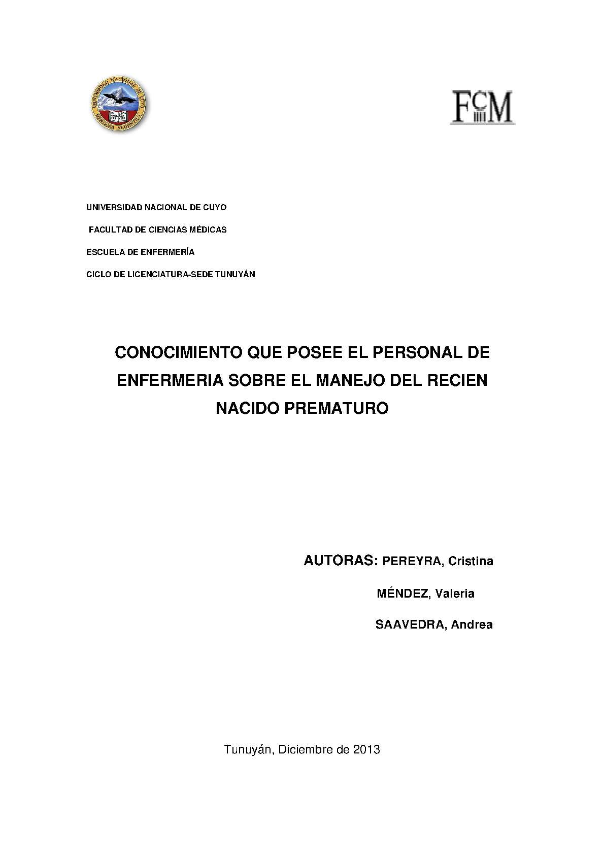 El presente estudio pretende saber qué conocimiento posee el personal de enfermería con respecto a las intervenciones mínimas en el recién nacido pre término en el área de neonatología del Hospital Scaravelli del departamento de Tunuyán, durante el segundo semestre del año 2013. Los objetivos son: determinar los conocimientos que posee el personal de enfermería sobre el protocolo de intervenciones mínimas en el recién nacido pre-término; identificar acciones de enfermería pertenecientes al protocolo de intervenciones mínimas del recién nacido pre-término; demostrar si el personal de Neonatología conoce las intervenciones mínimas que deben aplicarse al recién nacido prematuro; descubrir el tipo de conocimiento que posee el personal de enfermería del servicio de Neonatología sobre las intervenciones mínimas en el neonato prematuro; comparar las acciones del personal de enfermería del área de Neonatología con el protocolo de intervenciones mínimas en el recién nacido prematuro y detallar el manejo de neonatos prematuros por parte del personal de enfermería en el servicio de Neonatología.
