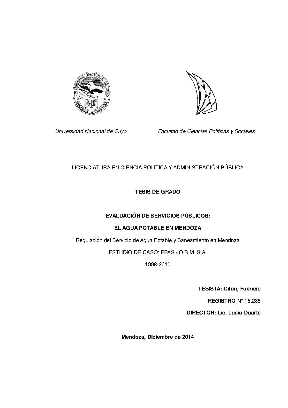 Citon, Fabricio. (2014). Evaluación de servicios públicos : el agua potable en Mendoza : regulación del servicio de agua potable y saneamiento en Mendoza : estudio de caso : EPAS/O.S.M. S.A. 1998-2010 (Tesina de grado). Mendoza, Universidad Nacional de Cuyo. Facultad de Ciencias Políticas y Sociales .
