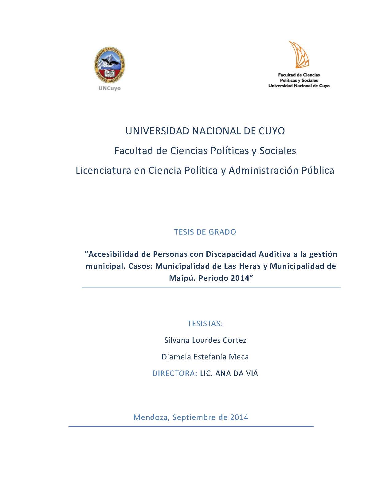 Cortez, Silvana Lourdes; Meca, Diamela Estefanía. (2014). Accesibilidad de personas con discapacidad auditiva a la gestión municipal: casos: Municipalidad de Las Heras y Municipalidad de Maipú : período 2014 (Tesina de grado). Mendoza, Universidad Nacional de Cuyo. Facultad de Ciencias Políticas y Sociales .