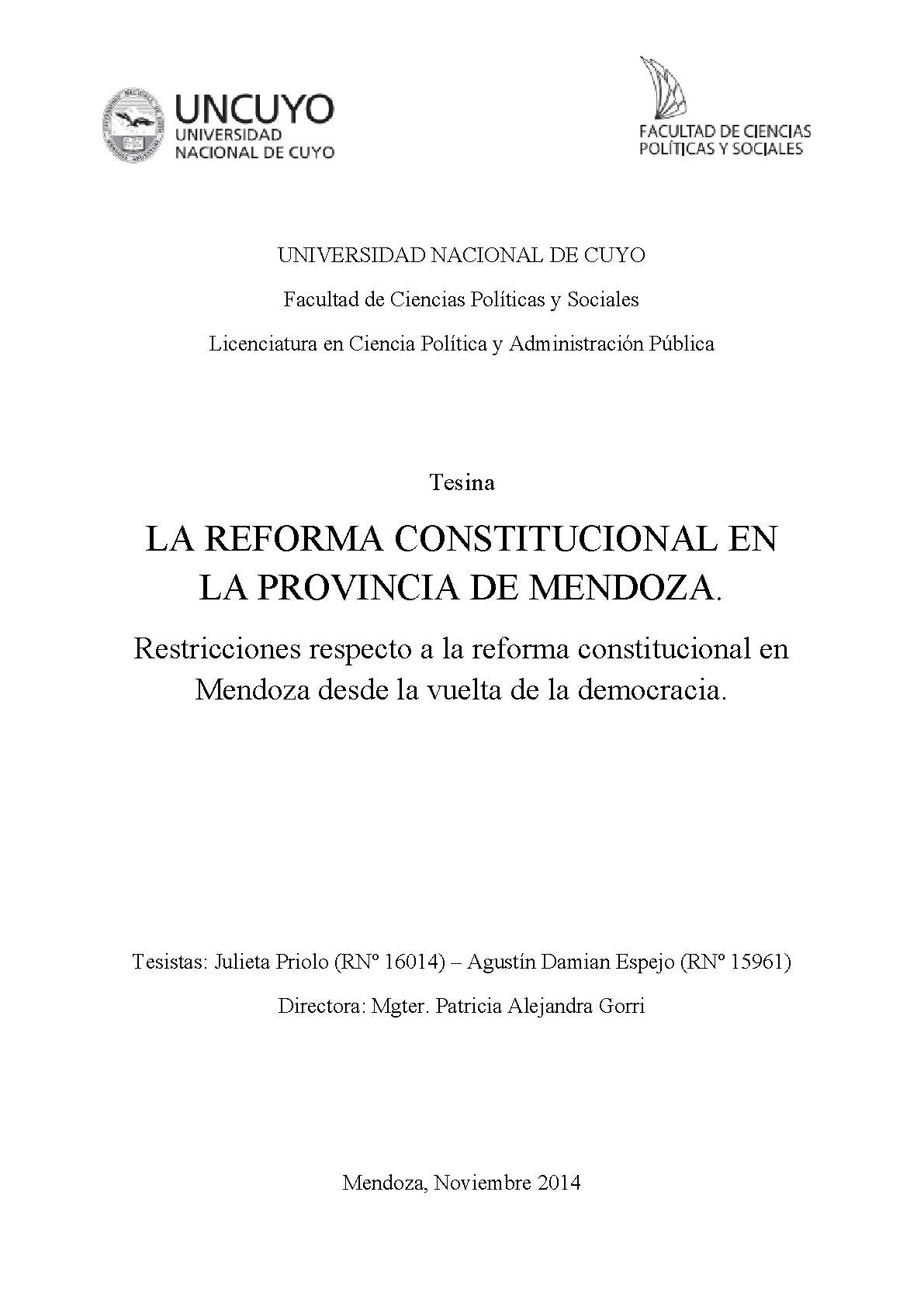 Priolo, Julieta; Espejo, Agustín Damian. (2014). La reforma constitucional en la provincia de Mendoza: restricciones respecto a la reforma constitucional en Mendoza desde la vuelta de la democracia (Tesina de grado). Mendoza, Universidad Nacional de Cuyo. Facultad de Ciencias Políticas y Sociales .