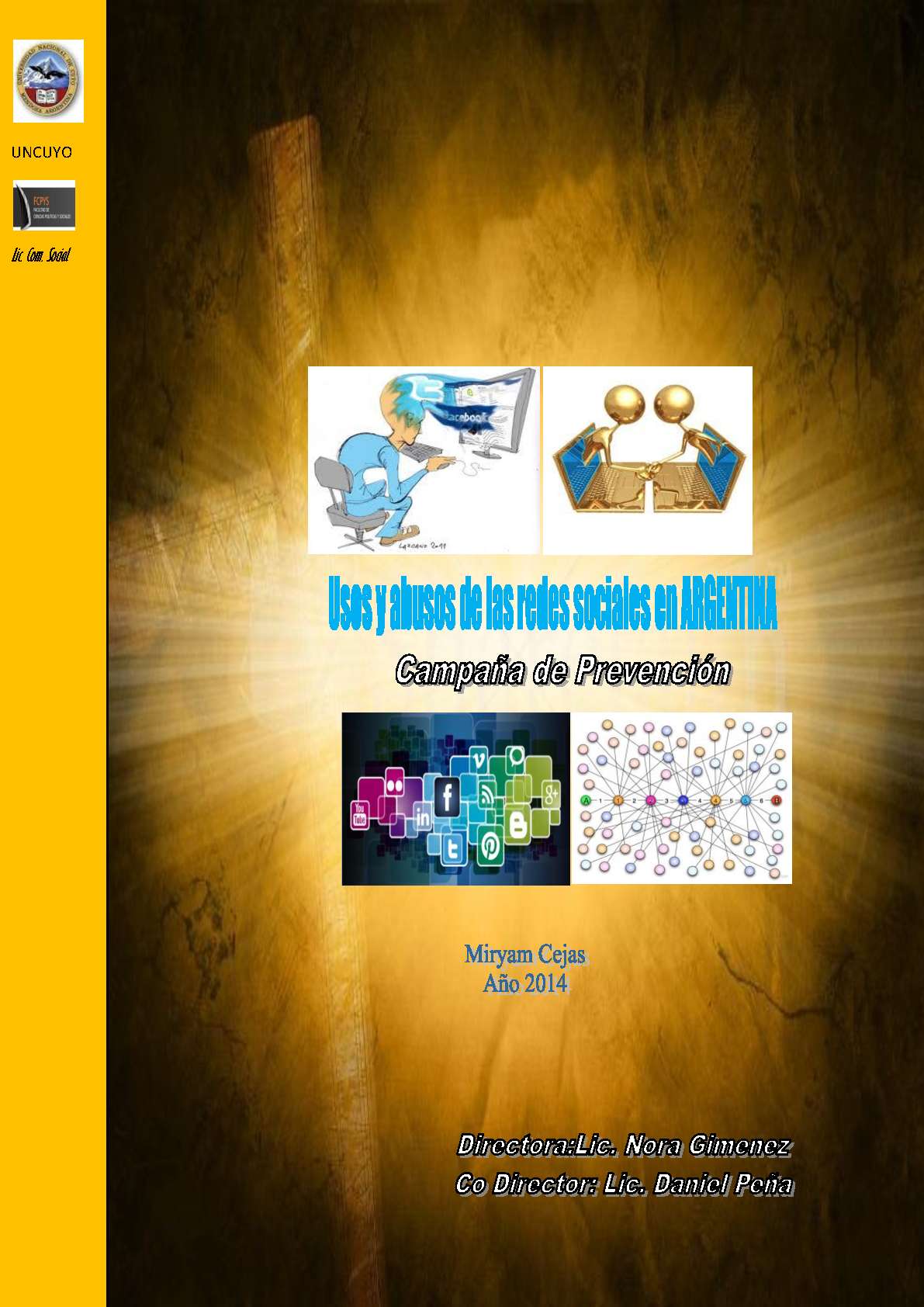 El objetivo del presente estudio es informar acerca de las redes sociales, su origen, desarrollo y su manera de imponerse en la sociedad; analizar cómo los cibernautas utilizan las redes sociales, el tiempo que le dedican; identificar las redes más populares; determinar los usos frecuentes y alertar sobre los abusos y consecuencias que suponen su mal uso; y, por último, establecer una campaña nacional de prevención bajo el slogan: “NO permitas el ABUSO, RESPETA tu vida"… Esta campaña intenta concientizar a niños y adolescentes sobre los peligros que suponen el uso descuidado de las redes. Alertar sus conductas para que no sean seducidos, engañados por individuos indeseables que se encuentran a “la pesca" de incautos para lograr sus delitos y abusos.