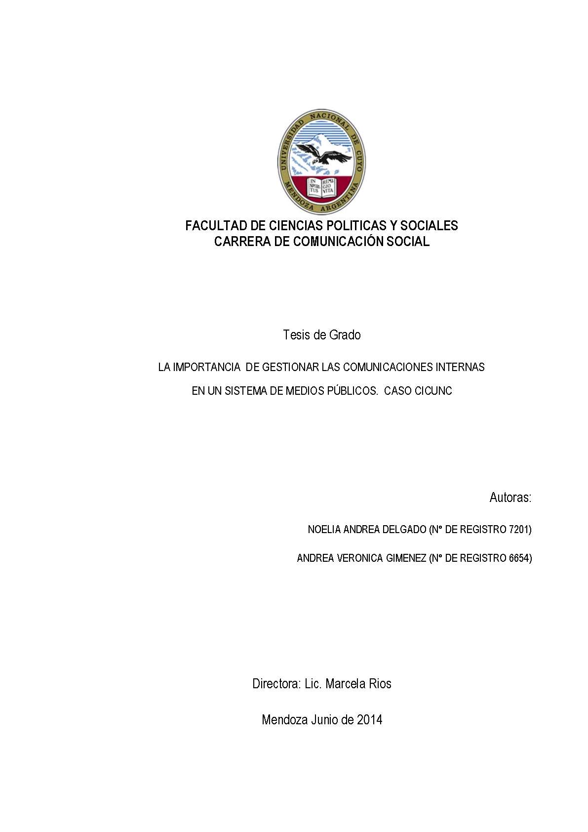 Delgado, Noelia; Giménez, Andrea Verónica. (2014). La importancia de gestionar las comunicaciones internas en un sistema de medios públicos: caso CICUNC (Tesina de grado). Mendoza, Universidad Nacional de Cuyo. Facultad de Ciencias Políticas y Sociales .