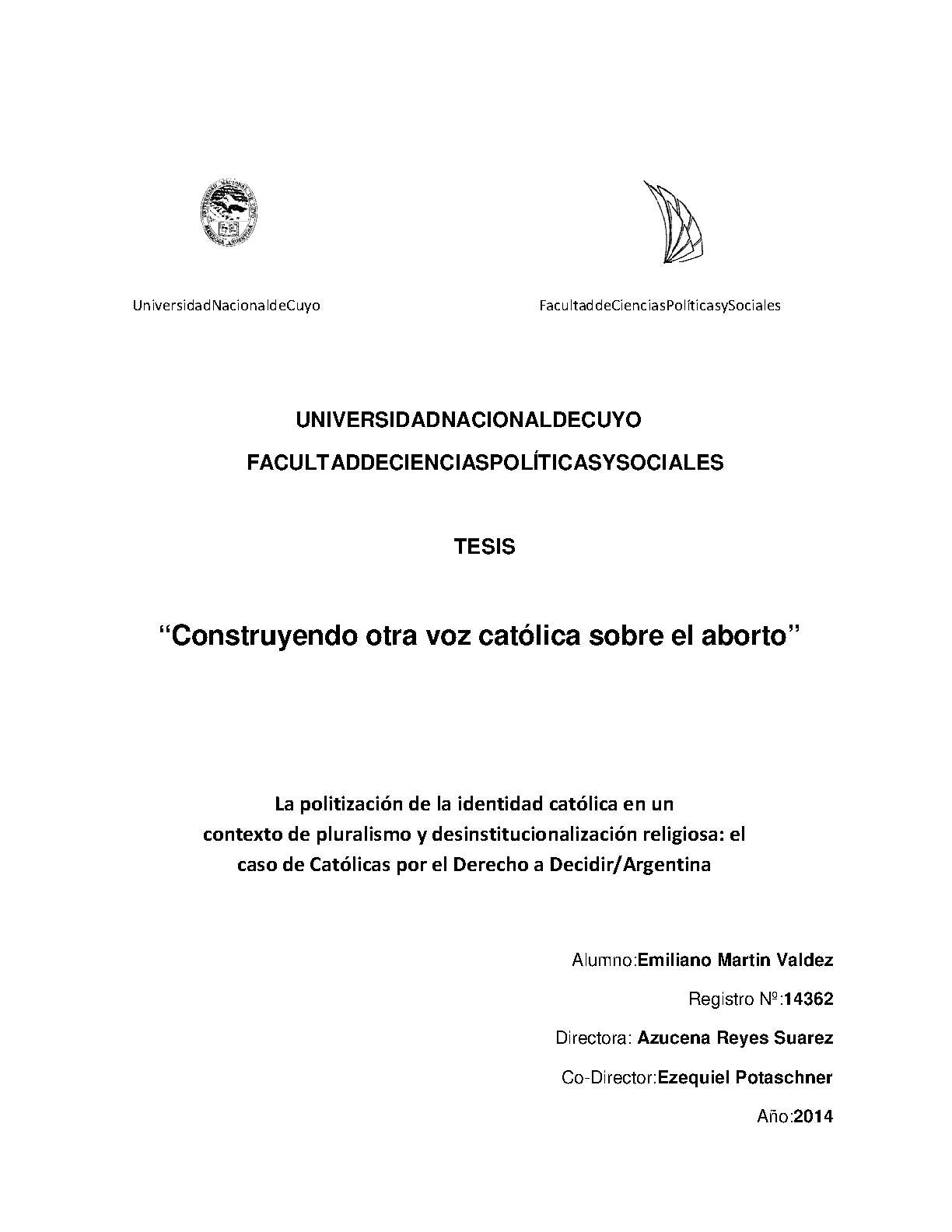 Martin Valdez, Emiliano. (2014). Construyendo otra voz católica sobre el aborto: la politización de la identidad católica en un contexto de pluralismo y desinstitucionalización religiosa : el caso de Católicas por el Derecho a Decidir/Argentina (Tesina de grado). Mendoza, Universidad Nacional de Cuyo. Facultad de Ciencias Políticas y Sociales .