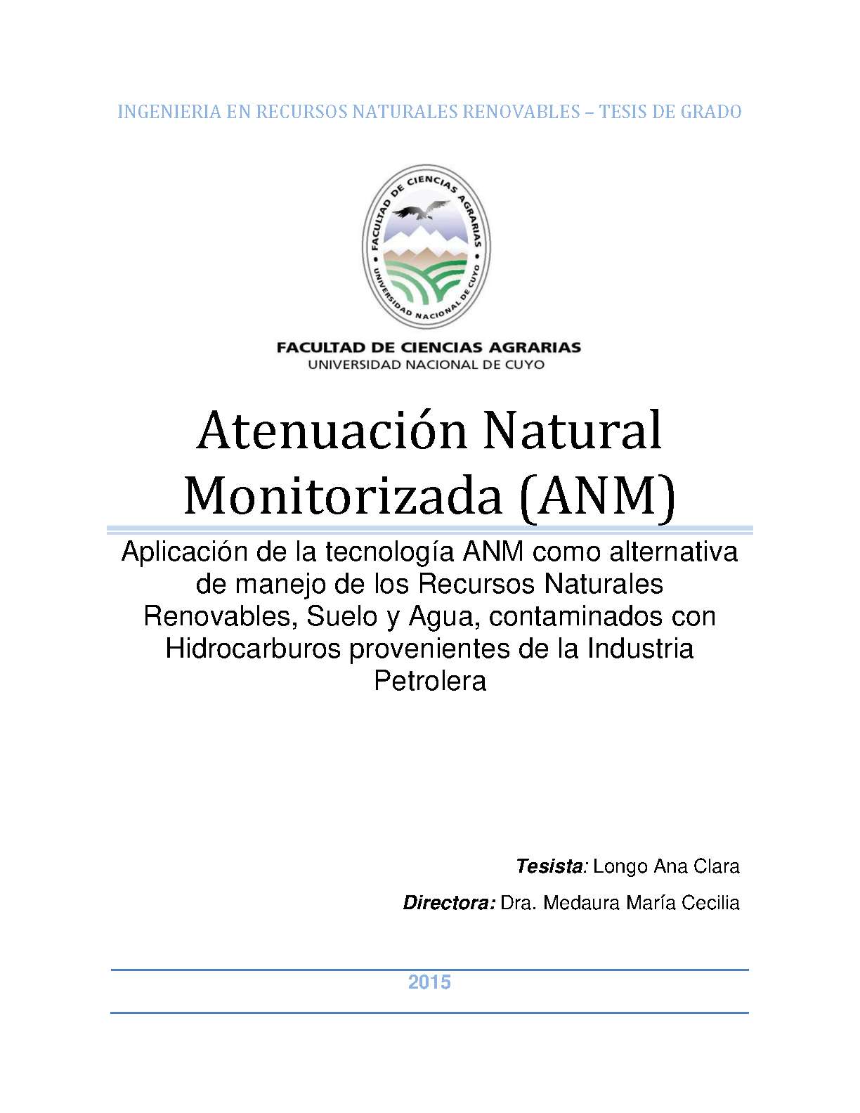 Este trabajo tiene como objeto presentar a la ANM como una opción de manejo óptima para casos de suelos y aguas subterráneas contaminadas con hidrocarburos de la industria del petróleo en la Provincia de Mendoza, dentro de la Cuenca Cuyana.