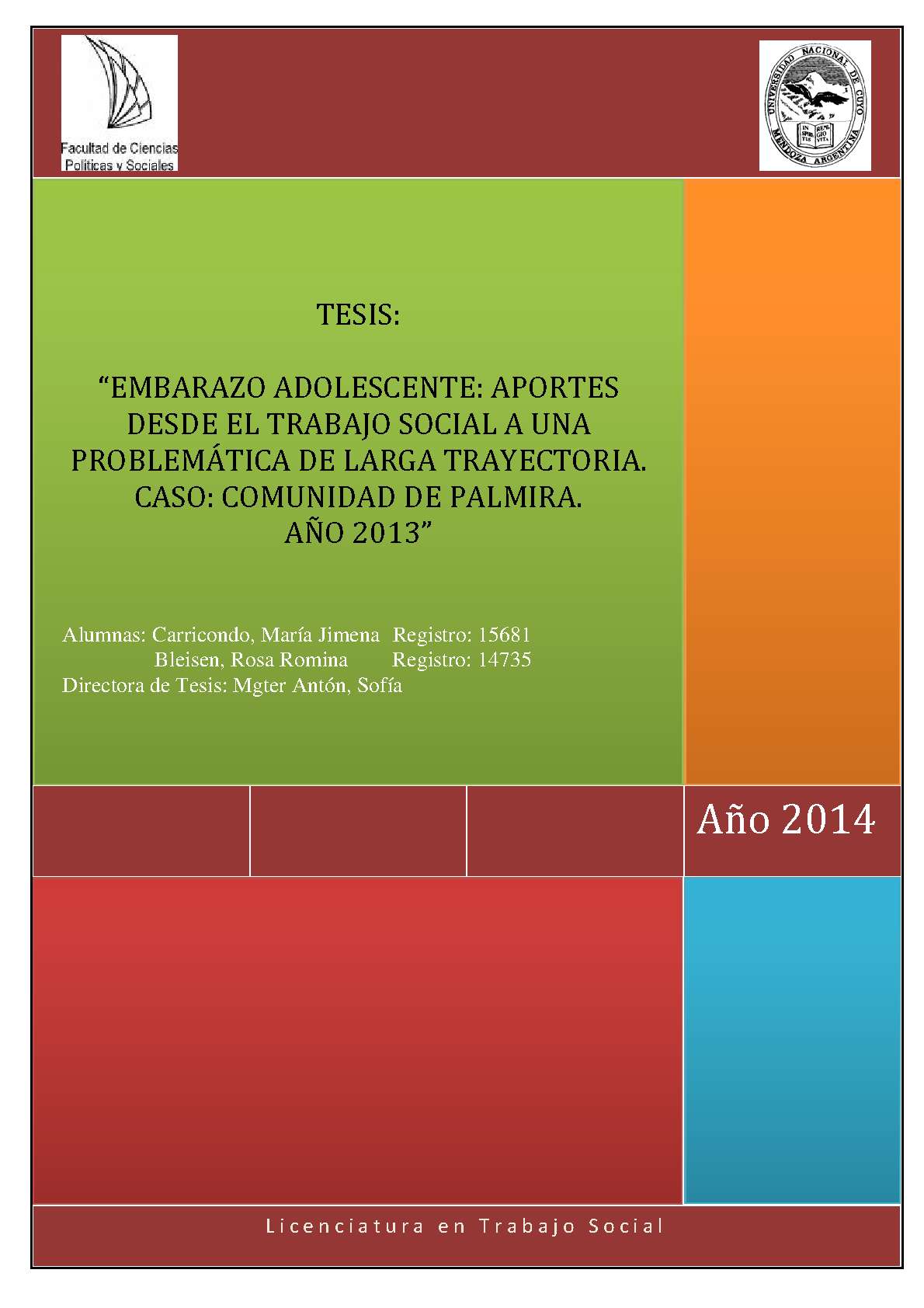 Carricondo, María Jimena; Bleisen, Rosa Romina. (2014). Embarazo adolescente: aportes desde el trabajo social a una problemática de larga trayectoria : caso: comunidad de Palmira (Tesina de grado). Mendoza, Universidad Nacional de Cuyo. Facultad de Ciencias Políticas y Sociales .
