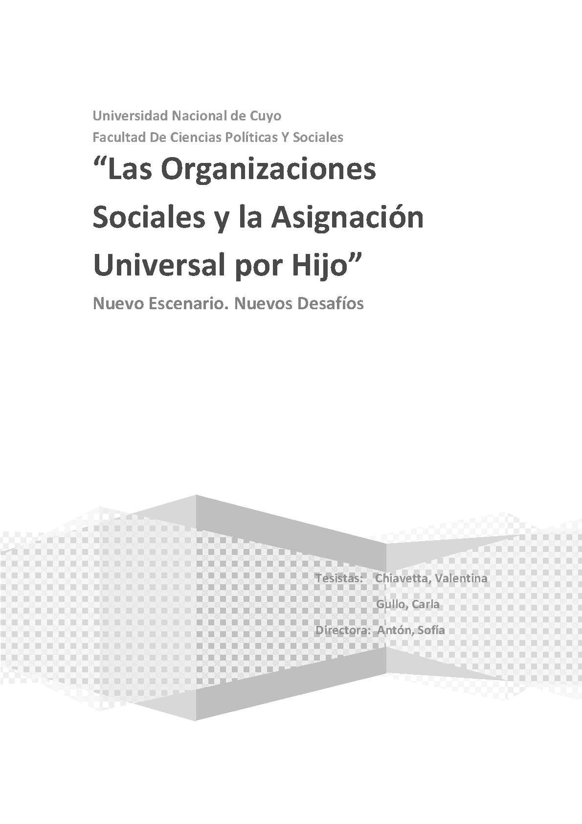 Chiavetta, Valentina; Gullo, Carla. (2014). Las Organizaciones Sociales y la Asignación Universal por Hijo: nuevo escenario : nuevos desafíos (Tesina de grado). Mendoza, Universidad Nacional de Cuyo. Facultad de Ciencias Políticas y Sociales .