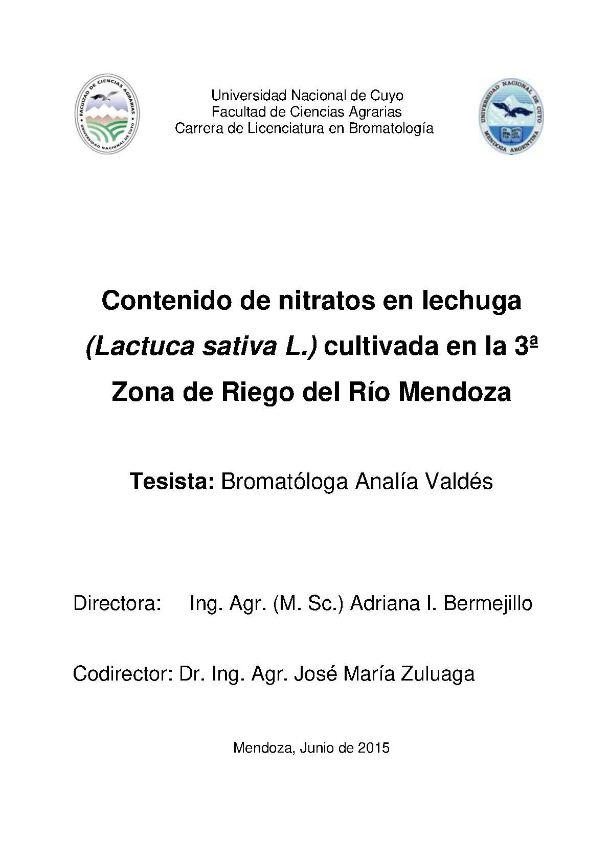 Valdés, Analía Ester. (2015). Contenido de nitratos en lechuga (Lactuca sativa L.) cultivada en la 3ª Zona de Riego del Río Mendoza: (Tesina de grado). Mendoza, Universidad Nacional de Cuyo. Facultad de Ciencias Agrarias .