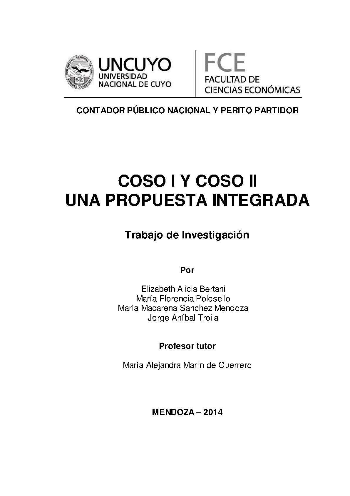 Bertani, Elizabeth Alicia; Polesello, María Florencia; Sánchez Mendoza, María Macarena; Troila, Jorge Aníbal. (2014). COSO I y COSO II: una propuesta integrada (Trabajo final de grado). Mendoza, Universidad Nacional de Cuyo. Facultad de Ciencias Económicas.