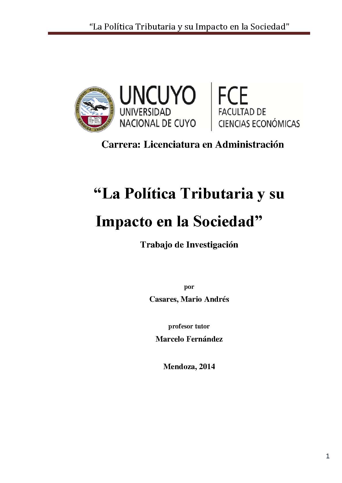 Casares, Mario Andrés. (2015). La política tributaria y su impacto en la sociedad: (Trabajo final de grado). Mendoza, Universidad Nacional de Cuyo. Facultad de Ciencias Económicas.
