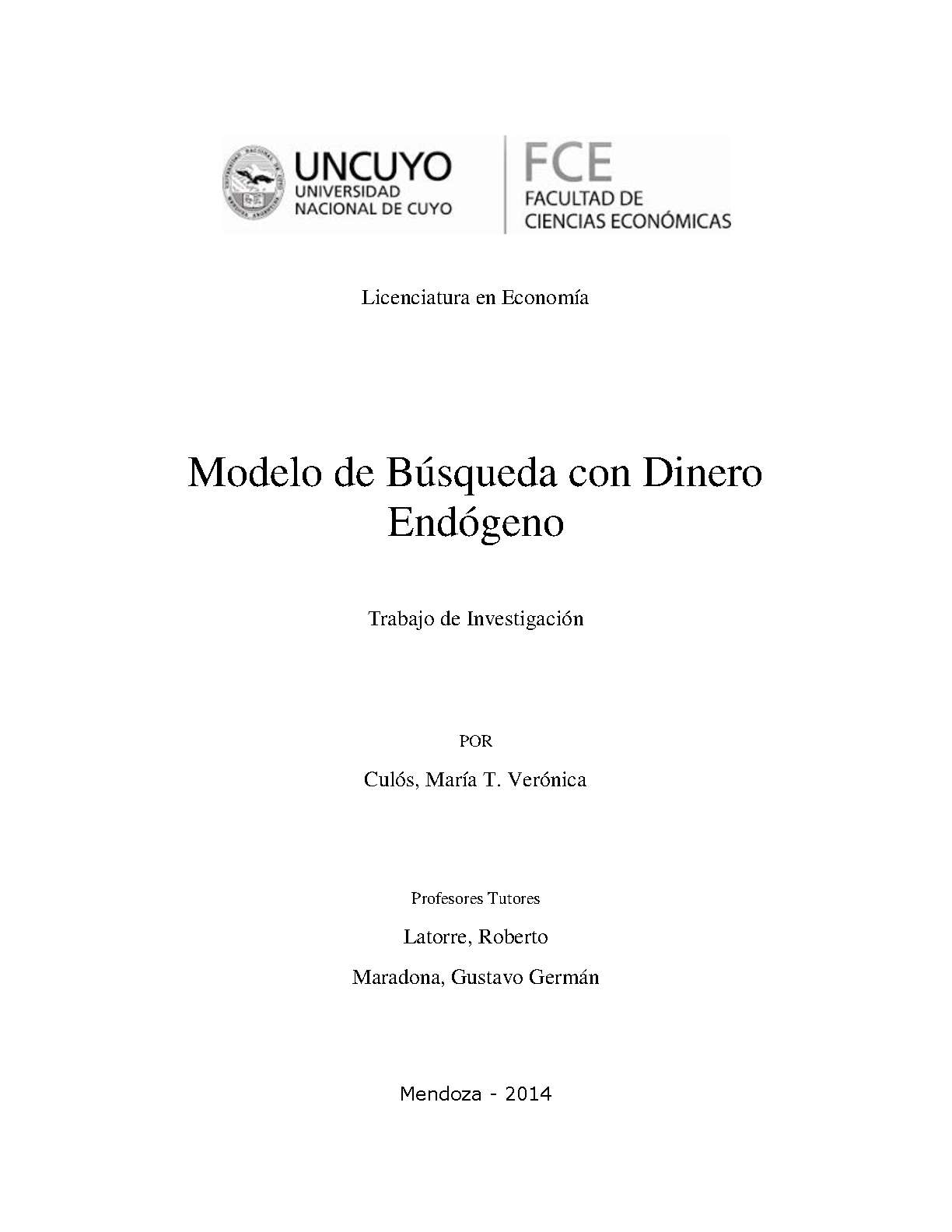 Culós, María Teresa Verónica. (2014). Modelo de búsqueda con dinero endógeno: (Trabajo final de grado). Mendoza, Universidad Nacional de Cuyo. Facultad de Ciencias Económicas.