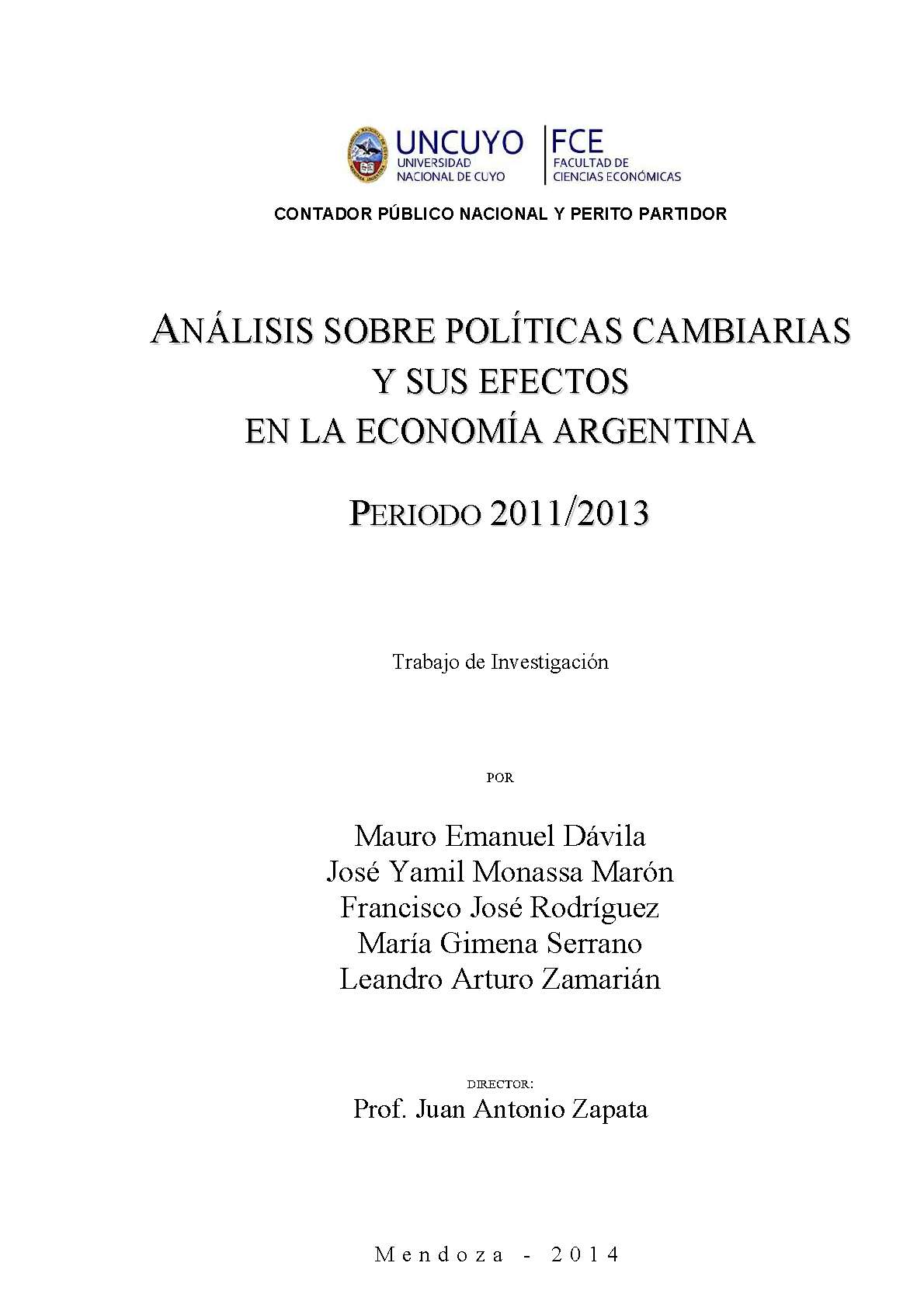 Dávila, Mauro Emanuel; Rodríguez, Francisco José; Monassa Marón, José Yamil; Serrano,María Gimena; Zamarián, Leandro Arturo. (2014). Análisis sobre políticas cambiarias y sus efectos en la economía argentina: periodo 2011/2013 (Trabajo final de grado). Mendoza, Universidad Nacional de Cuyo. Facultad de Ciencias Económicas.