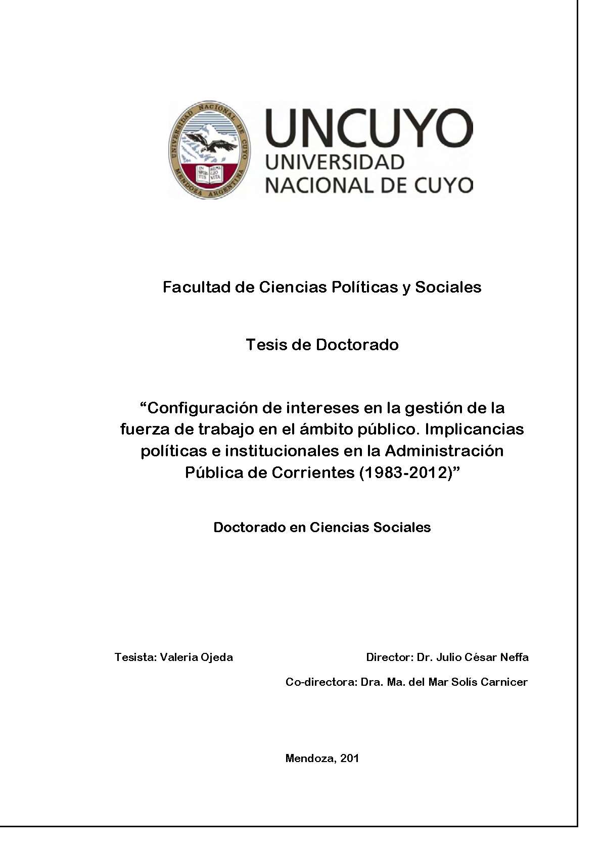 Ojeda, Valeria Patricia. (2014). Configuración de intereses en la gestión de la fuerza de trabajo en el ámbito público: implicancias políticas e institucionales en la administración pública de Corrientes : (1983-2012) (Tesis de Doctorado). Mendoza, Universidad Nacional de Cuyo. Facultad de Ciencias Políticas y Sociales .