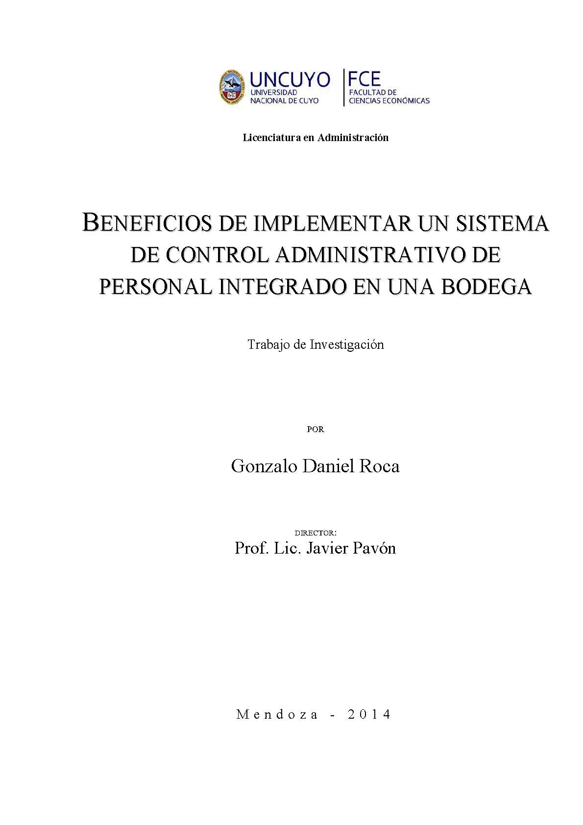 Roca, Gonzalo Daniel. (2014). Beneficios de implementar un sistema de control administrativo de personal integrado a una bodega: (Trabajo final de grado). Mendoza, Universidad Nacional de Cuyo. Facultad de Ciencias Económicas.