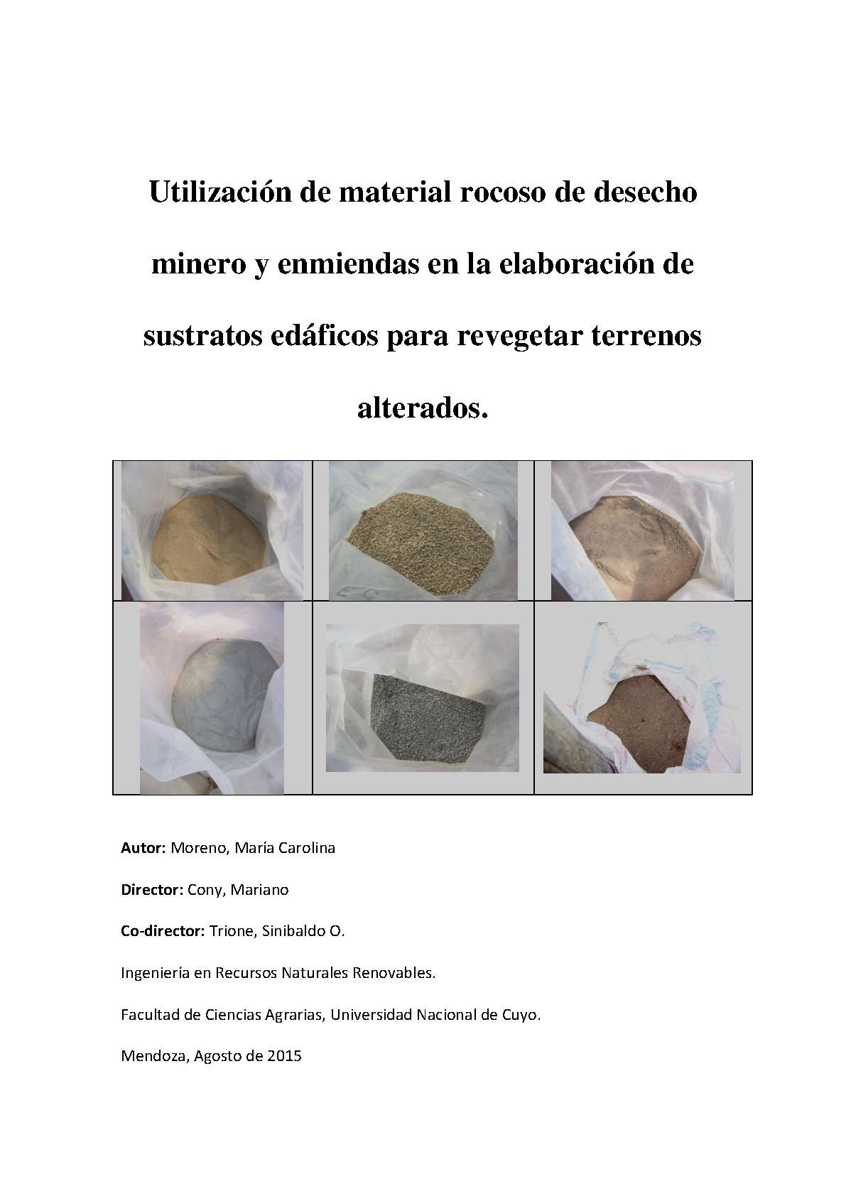 Moreno, María Carolina. (2015). Utilización de material rocoso de desecho minero y enmiendas en la elaboración de sustratos edáficos para revegetar terrenos alterados: (Tesina de grado). Mendoza, Universidad Nacional de Cuyo. Facultad de Ciencias Agrarias .
