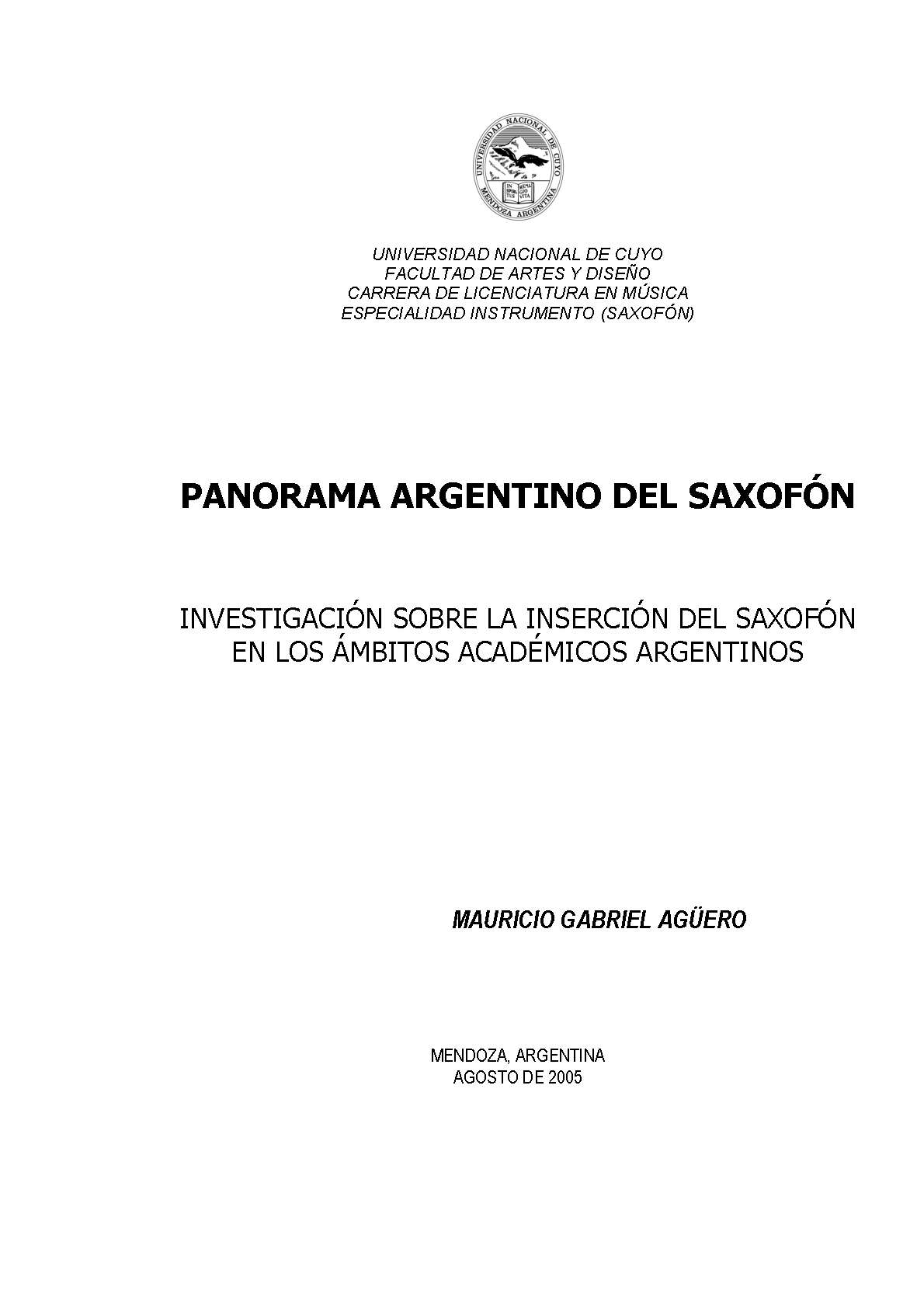 Agüero, Mauricio Gabriel. (2005). Panorama argentino del saxofón: investigación sobre la inserción del saxofón en los ámbitos académicos argentinos (Tesina de grado). Mendoza, Universidad Nacional de Cuyo. Facultad de Artes y Diseño. Escuela de Música.