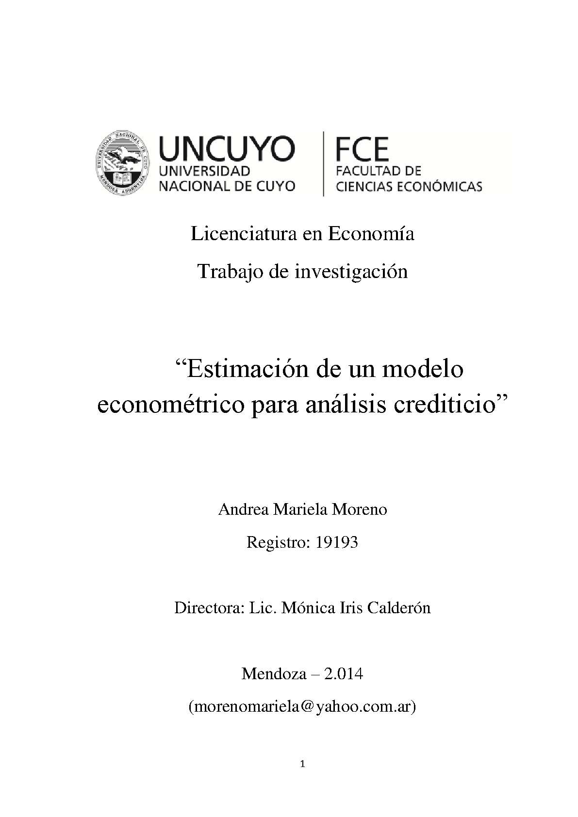 Moreno, Andrea Mariela. (2014). Estimación de un modelo econométrico para análisis crediticio: (Trabajo final de grado). Mendoza, Universidad Nacional de Cuyo. Facultad de Ciencias Económicas.