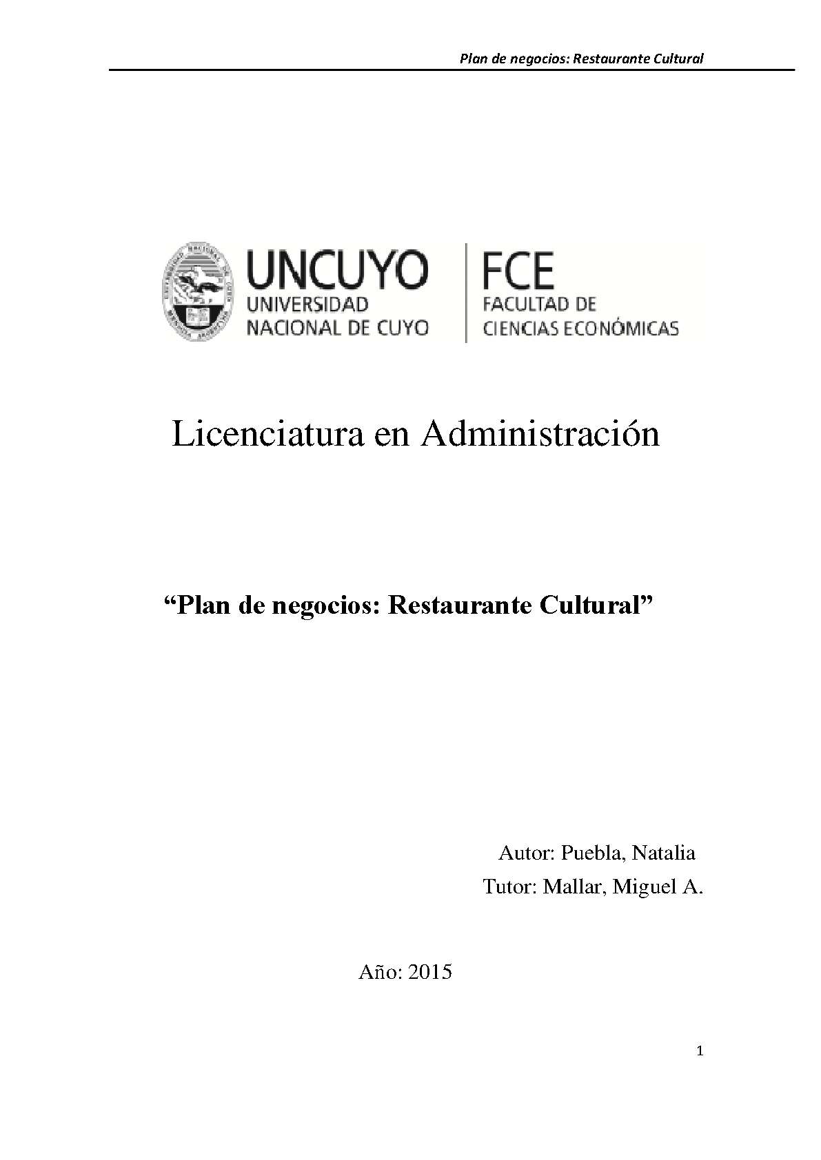 Puebla, Natalia. (2015). Plan de negocios: restaurante cultural (Trabajo final de grado). Mendoza, Universidad Nacional de Cuyo. Facultad de Ciencias Económicas.