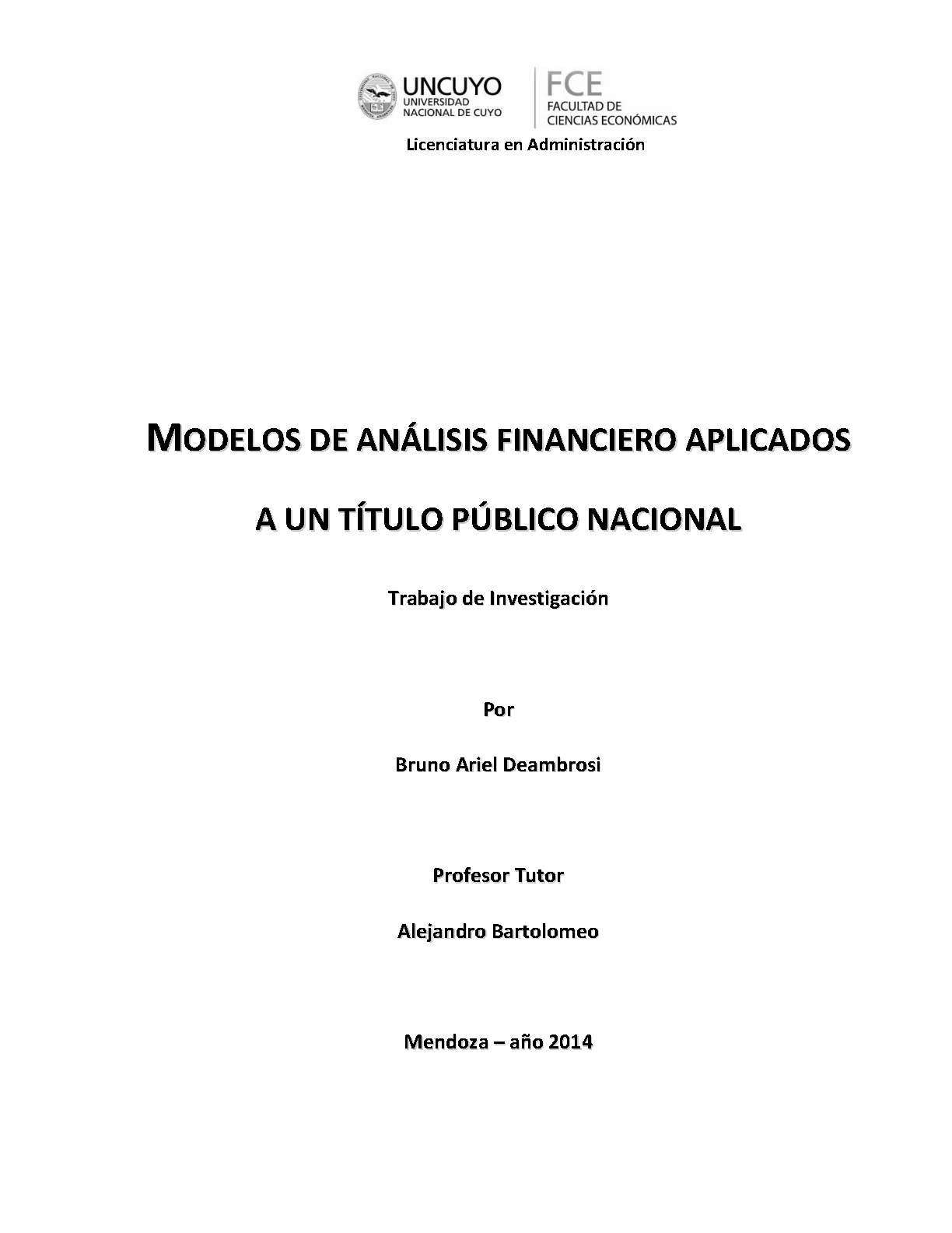 Deambrosi, Bruno Ariel. (2014). Modelos de análisis financieros aplicados a un título público nacional: (Trabajo final de grado). Mendoza, Universidad Nacional de Cuyo. Facultad de Ciencias Económicas.