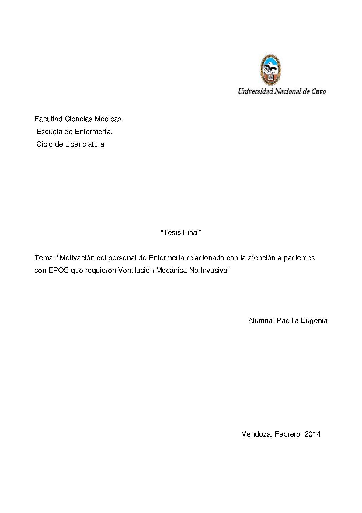 Padilla, Eugenia. (2014). Motivación del personal de enfermería relacionado con la atención a pacientes con EPOC que requieren ventilación mecánica no invasiva: (Tesina de grado). Mendoza, Universidad Nacional de Cuyo. Facultad de Ciencias Médicas. Escuela de Enfermería..