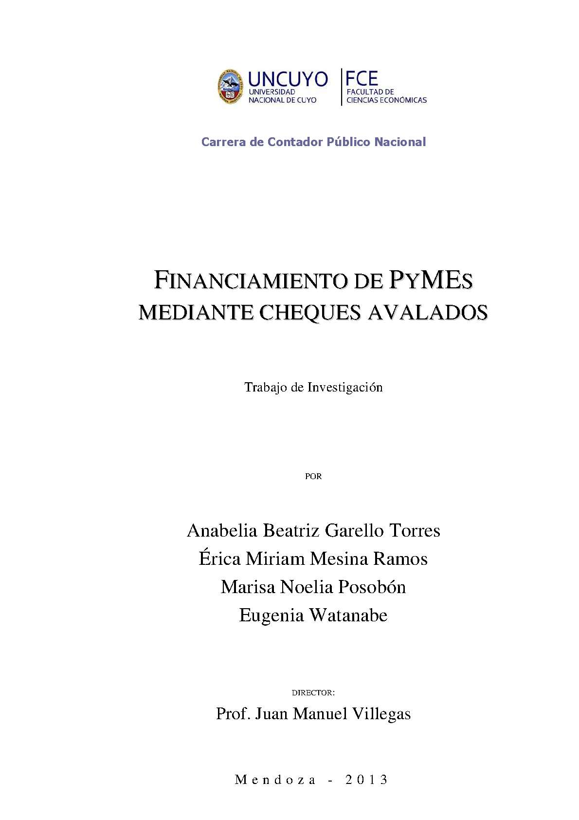 Garello Torres, Anabelia Beatriz; Mesina Ramos, Érica Miriam; Posobón, Marisa Noelia; Watanabe, Eugenia. (2013). Financiamiento de PyMES mediante cheques avalados: (Trabajo final de grado). Mendoza, Universidad Nacional de Cuyo. Facultad de Ciencias Económicas.