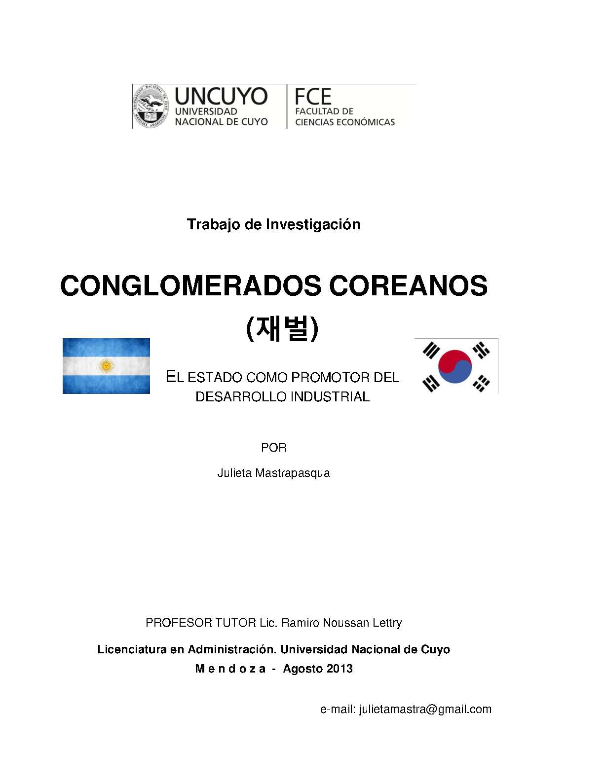 Mastrapasqua, Julieta. (2013). Conglomerados coreanos (재벌): el estado como promotor del desarrollo industrial (Trabajo final de grado). Mendoza, Universidad Nacional de Cuyo. Facultad de Ciencias Económicas.