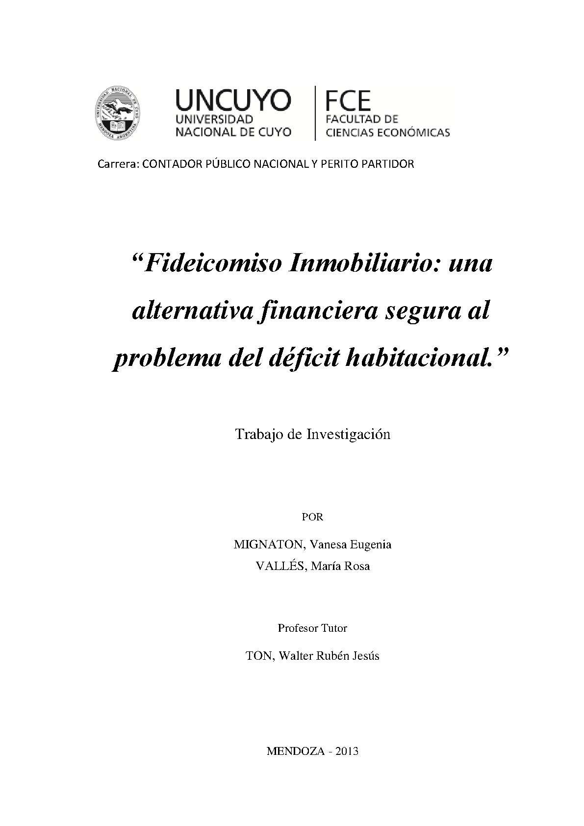Mignaton, Vanesa Eugenia; Vallés, María Rosa. (2013). Fideicomiso inmobiliario: una alternativa financiera segura al problema del déficit habitacional (Trabajo final de grado). Mendoza, Universidad Nacional de Cuyo. Facultad de Ciencias Económicas.