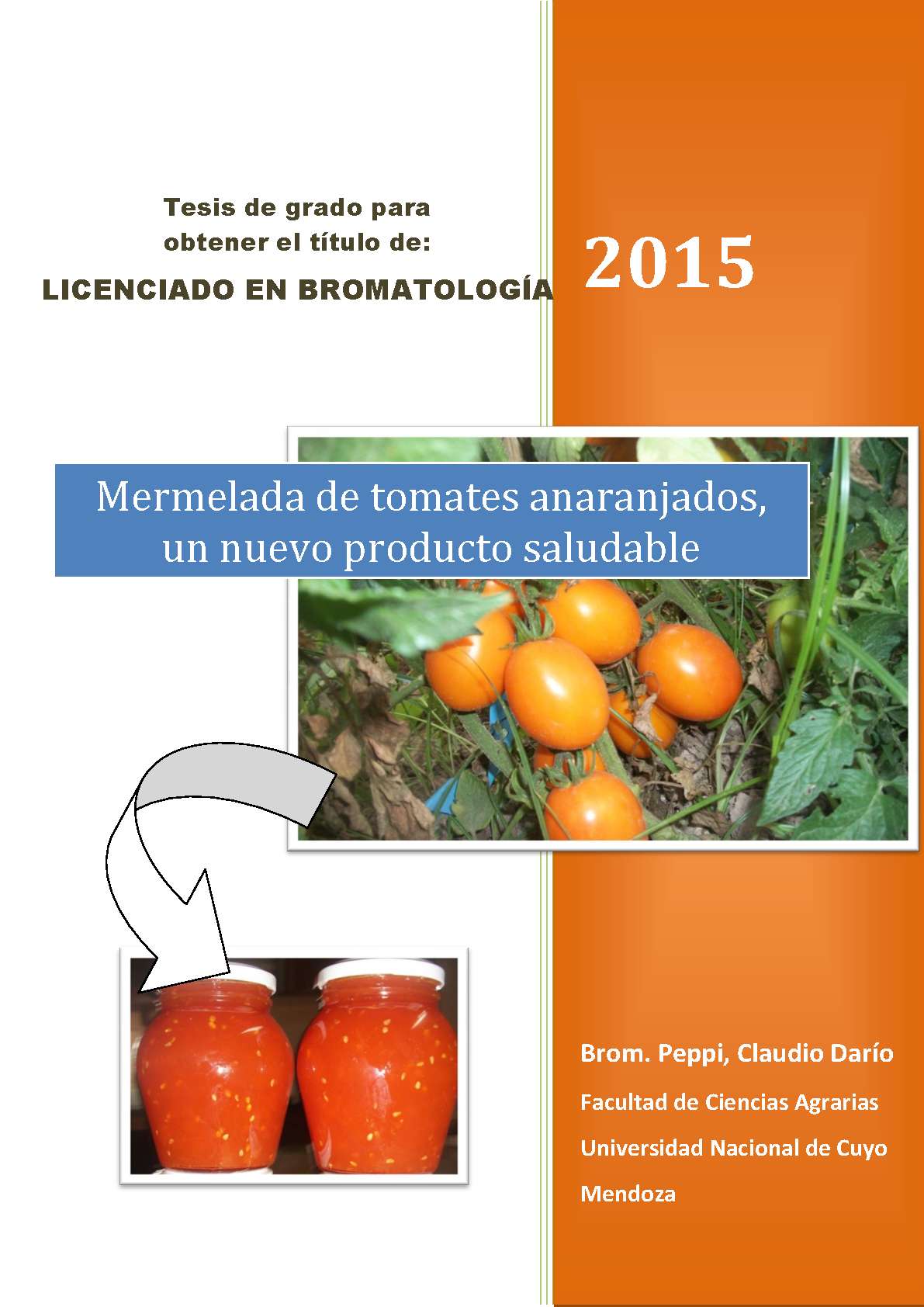 La demanda actual de los consumidores se orienta hacia productos que además de un buen contenido nutricional, presenten características beneficiosas para la salud. Considerando esta tendencia, este trabajo se ha enfocado en generar un nuevo producto procesado de tomate, diferenciado por sus propiedades nutricionales, sensoriales y saludables. Se seleccionaron frutos de dos variedades tipo perita de tomates anaranjados, de crecimiento determinado e indeterminado, generados por un proyecto de mejoramiento de tomate de la Facultad de Ciencias Agrarias (06/A605 SECTyP – UNCuyo). Los frutos frescos de las dos variedades fueron analizados por el contenido de polifenoles totales, licopenos y carotenos y por su actividad antioxidante. Se seleccionó la variedad indeterminada de frutos anaranjados para la elaboración de la mermelada de tomate, ya que los frutos presentaron un mejor perfil de compuestos antioxidantes. La variedad seleccionada para la elaboración fue caracterizada previamente por su composición físico-química. En el producto elaborado se determinó la composición nutricional centesimal, su aporte en compuestos fitoquímicos (polifenoles totales, licopenos y carotenos) y su actividad antioxidante. Se evaluó la aceptación de la mermelada por parte de los consumidores potenciales, a través del análisis sensorial. Este nuevo producto tuvo una elevada aceptación por sus características sensoriales, que sumado al contenido de antioxidantes, hace que la mermelada de tomates anaranjados sea una opción saludable para incorporar en la alimentación.