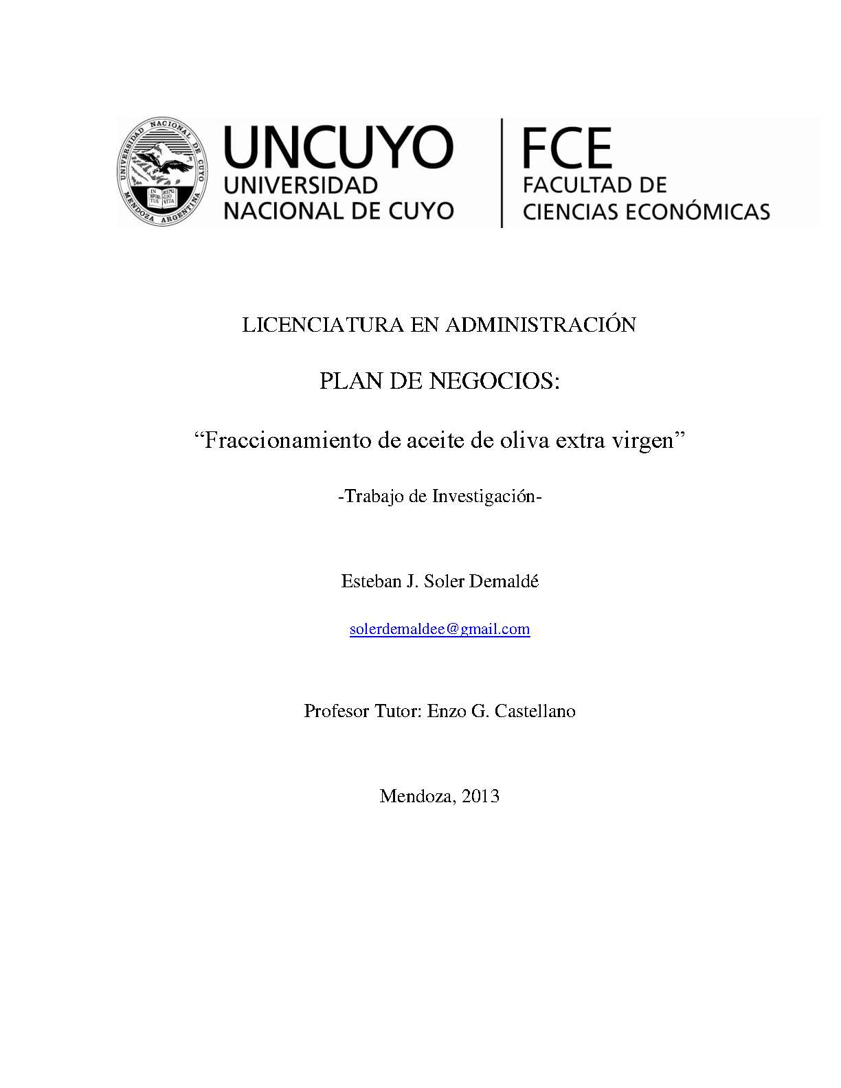 Soler Demaldé, Esteban Javier. (2013). Plan de negocios: fraccionamiento de aceite de oliva extra virgen (Trabajo final de grado). Mendoza, Universidad Nacional de Cuyo. Facultad de Ciencias Económicas.