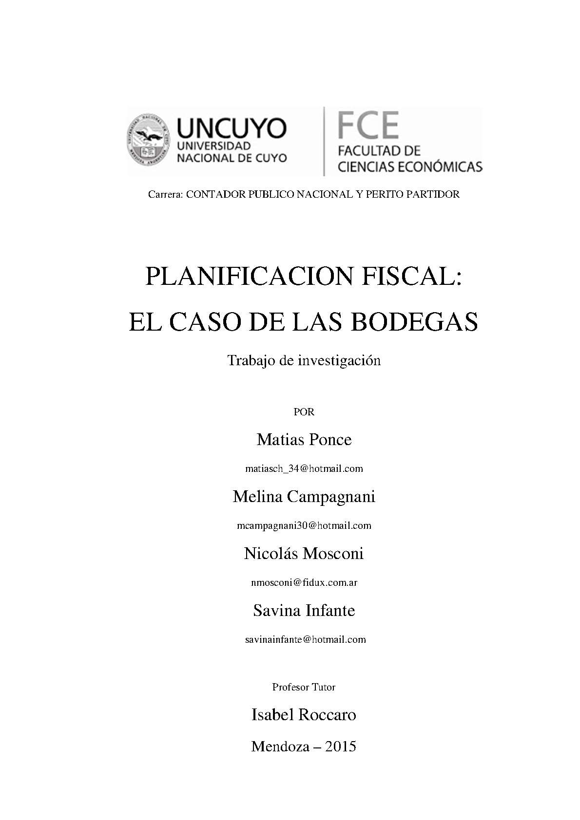 Ponce, Matías; Campagnani, Melisa; Mosconi, Nicolás; Infante, Savina. (2014). Planificación fiscal: el caso de las bodegas (Trabajo final de grado). Mendoza, Universidad Nacional de Cuyo. Facultad de Ciencias Económicas.